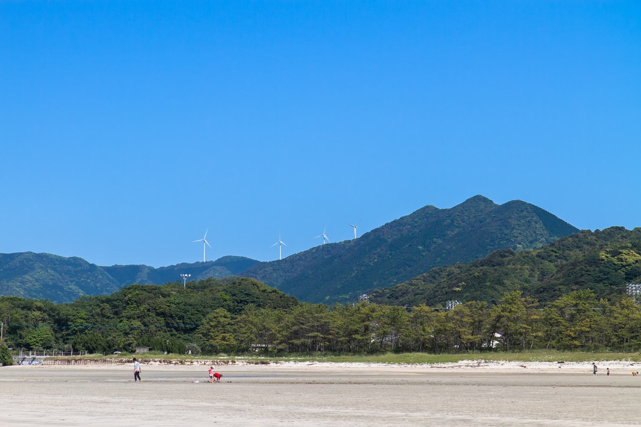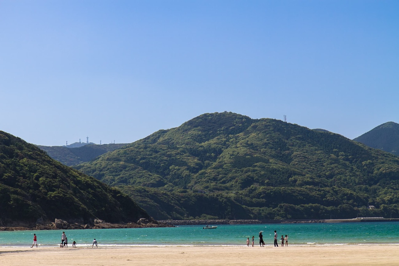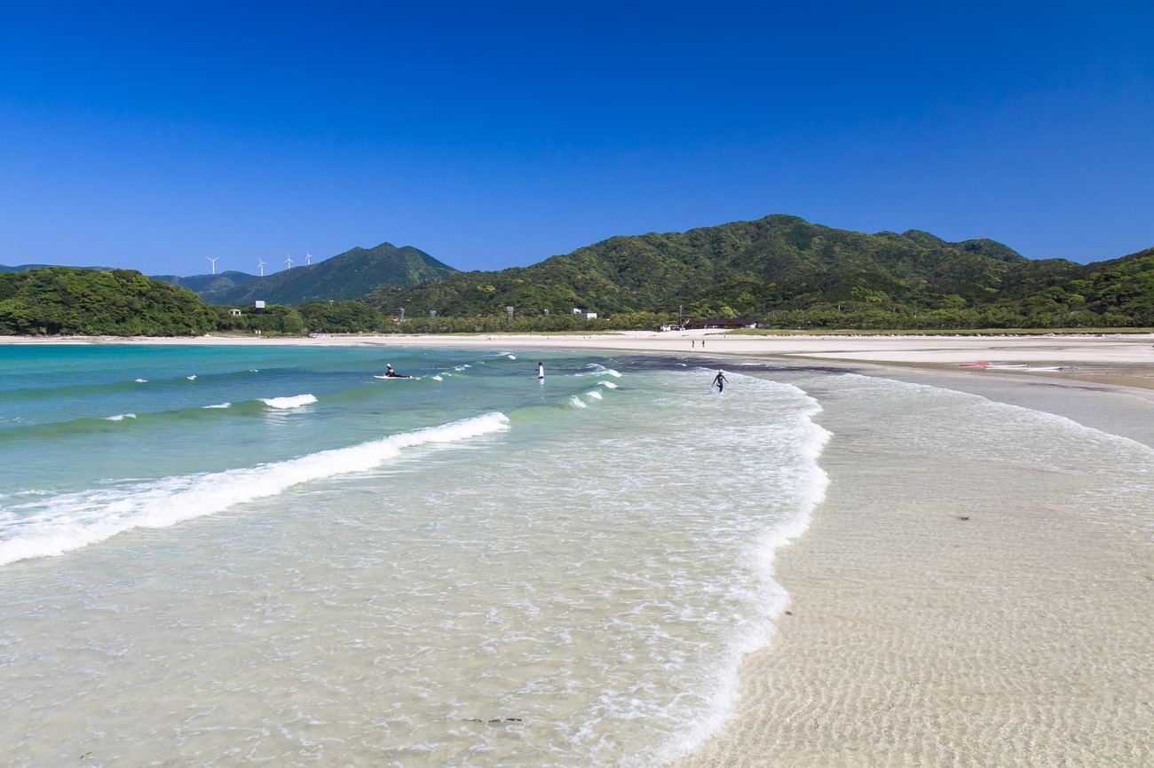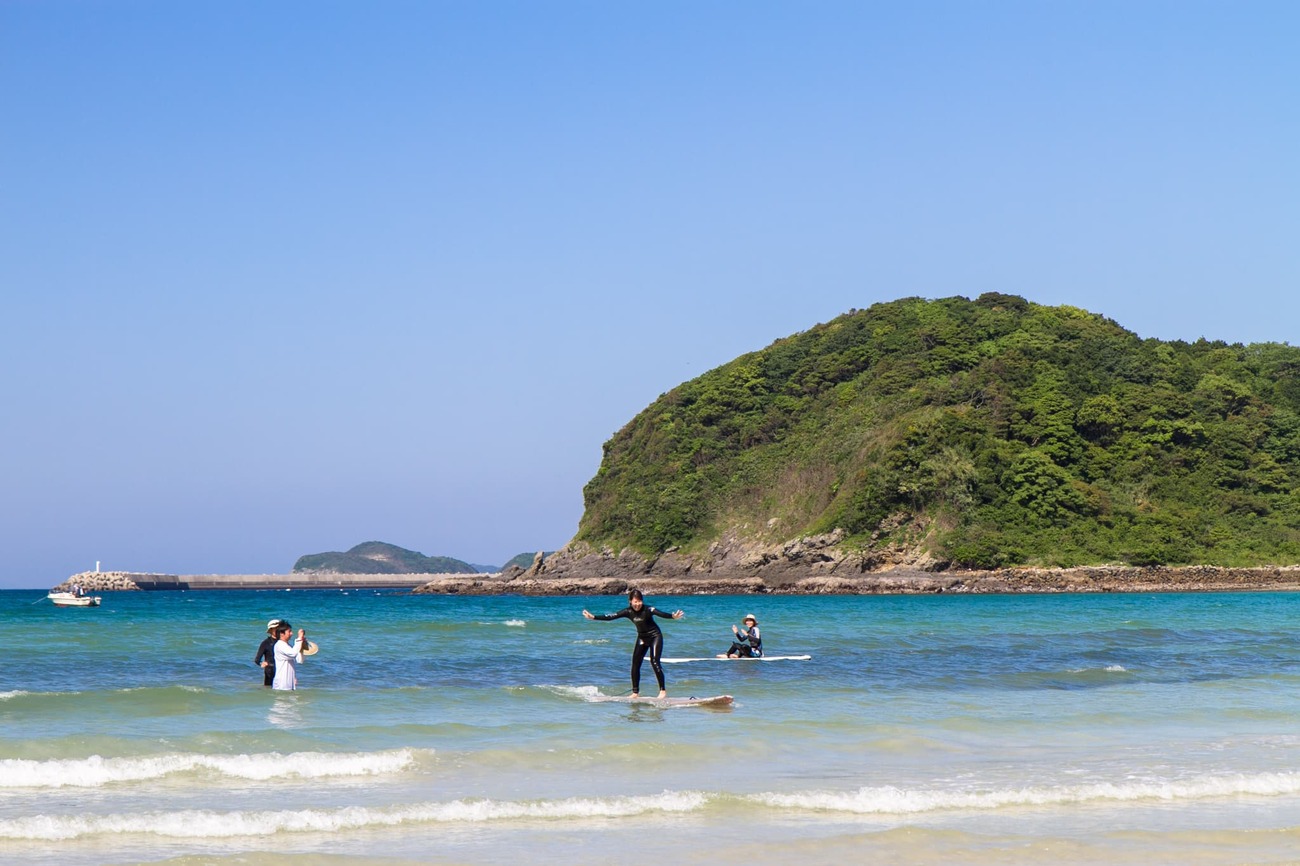 島北部の教会巡りから戻ってきて、午後は中通島随一の町・有川で昼食をとりつつ、前日に島の人にオススメされた「蛤浜」へとやってきました。すぐ近くに島で一番の町があるのに、遠浅の青い海と白砂が広がるその風景は、まさに絵に描いたような美しさ。波打ち際に立って、穏やかな海にしばし心を預けました。写真を撮っていると「こんにちはー!」と言いながらやってきたのは、昨日の居酒屋でこの浜を進めてくれた女性でした。サーフィンの練習をしているそうで、せっかくなので帰る後ろ姿を1枚撮らせてもらいました。