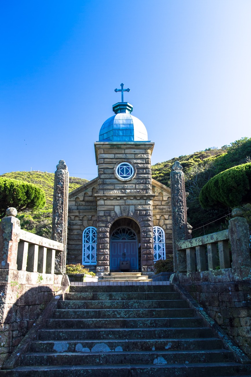 頭ヶ島には、西日本で唯一の「石造り」の教会で、世界遺産の構成資産のひとつでもある「頭ヶ島天主堂」があります。1919(大正8)年に鉄川与助の設計・施工で完成した教会は、頭ヶ島やすぐ北にあるロクロ島で、「五島石」と呼ばれる砂岩を切り出し、積み上げて作り上げたもの。壁面に漂う武骨さは、この日見てきた他の教会のどれとも違っています。堂内は白い壁、水色の梁の天井に椿のような意匠が並び、「花の御堂」とも呼ばれる可憐さが、外観とは対称的でした。