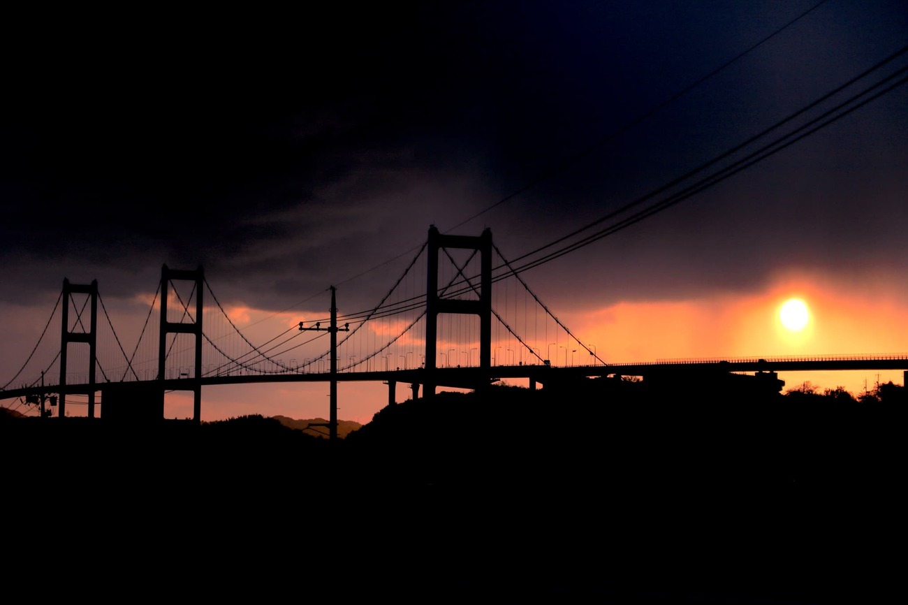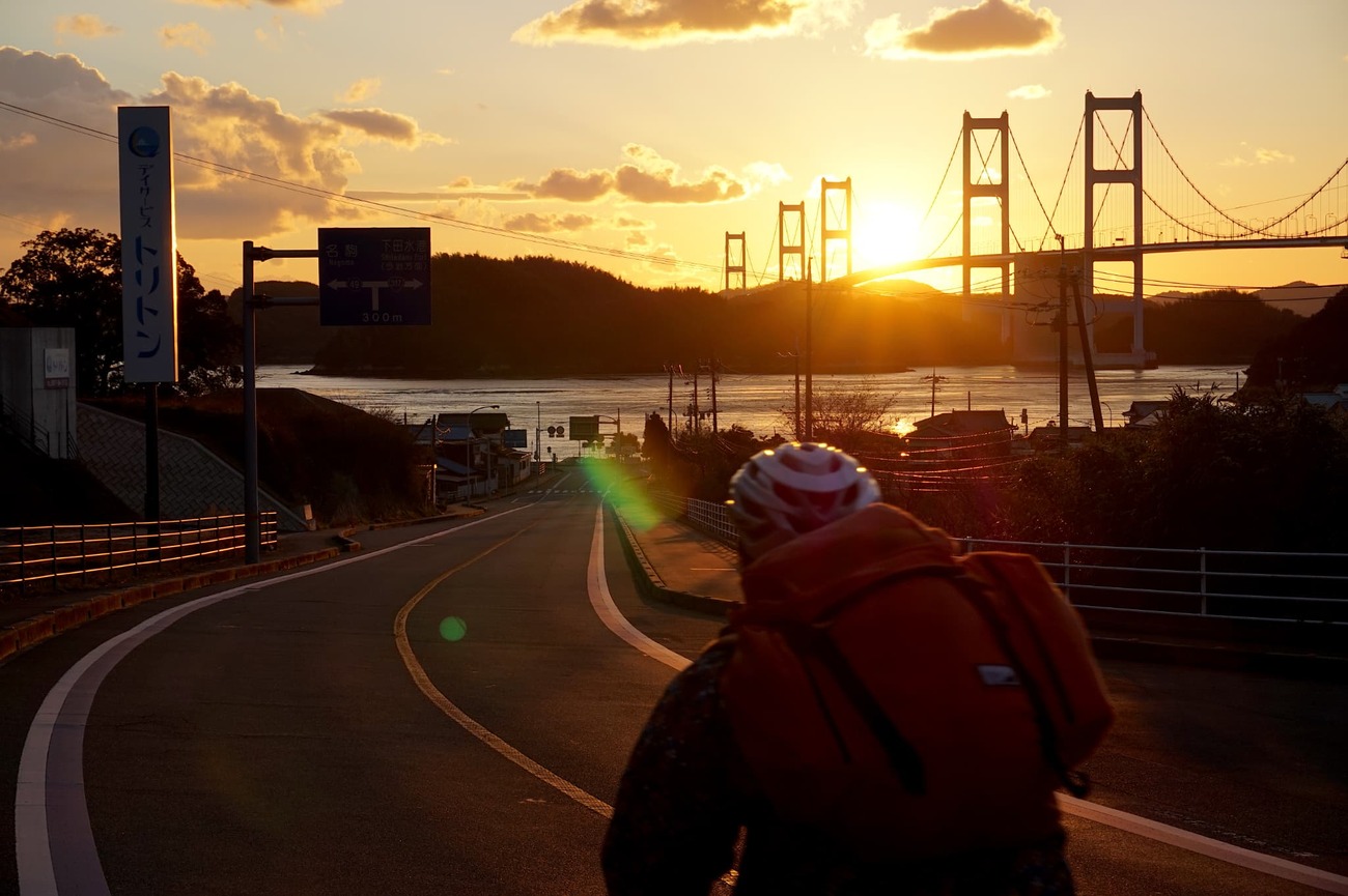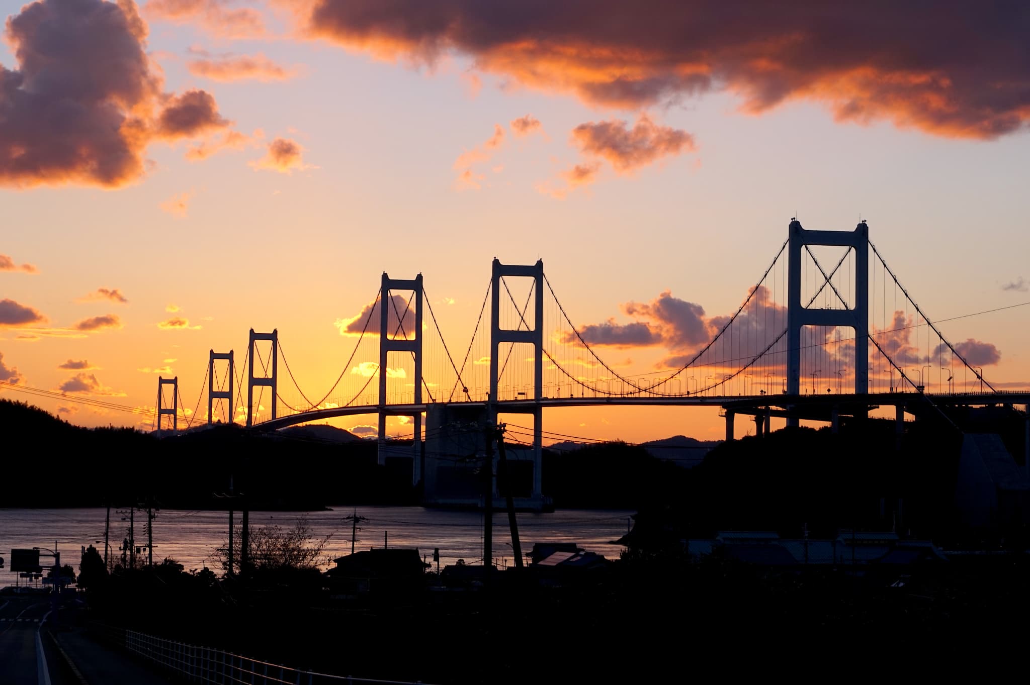 しまなみ海道は、広島県尾道市から愛媛県今治市を結ぶ全長約70kmの海の道。サイクリスト憧れのルートとして知られ、瀬戸内海に点在する島々を橋でつなぎながら、多島美を横目に走ることができます。その中でも大島と四国本土を隔てる来島海峡は、潮の流れが速く、昔から海の難所として有名です。この海峡に架かる来島海峡大橋は、しまなみ海道最大の橋で、夕暮れ時には感動の景色を見せてくれます。太陽が水平線へと沈みゆくころ、海と空はやわらかなオレンジ色に染まり、橋の構造美を引き立てながら、ゆるやかな潮流にきらめく光が旅の終わりを彩ります。条件がそろえば、雲に映える茜色のグラデーションが一層幻想的で、長い道のりを走りきった達成感とともに心に残るはず。来島海峡大橋の夕景は、しまなみ海道を締めくくる最高のご褒美です。