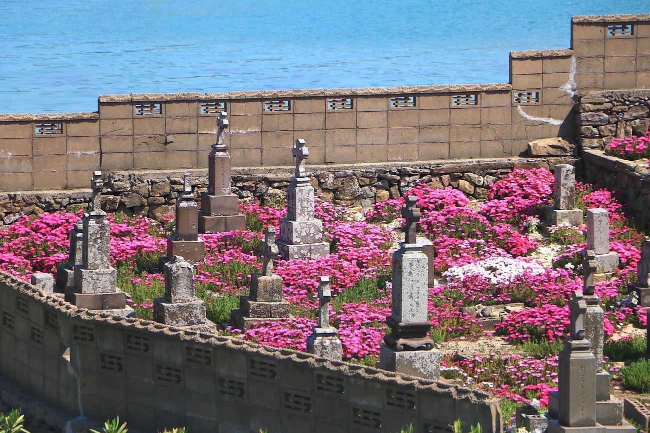 上五島・中通島北部に位置する孤島「頭ヶ島」は、幕末まで無人島でしたが、明治初期に迫害を逃れた潜伏キリシタンが移り住み、集落が築かれました。彼らが信仰を守り抜き、カトリックに復帰して建てたのが、世界遺産にも登録されている「頭ヶ島天主堂」です。島の五島石を切り出して積み上げた石造の教会堂は、日本の素材とヨーロッパの様式が融合した、独自のキリシタン文化を象徴する建築物として今も静かに佇んでいます。経済的に恵まれない中で築かれたその姿は、信徒たちの強い信仰の証そのもの。隣接する墓地では4月〜6月の期間、ピンク色のマツバギクが咲き誇り、唯一無二の鮮烈な風景を見せてくれます。その光景はまさに、最果ての地でキリシタンたちが信仰を守り抜いてきたことを讃えているようです。