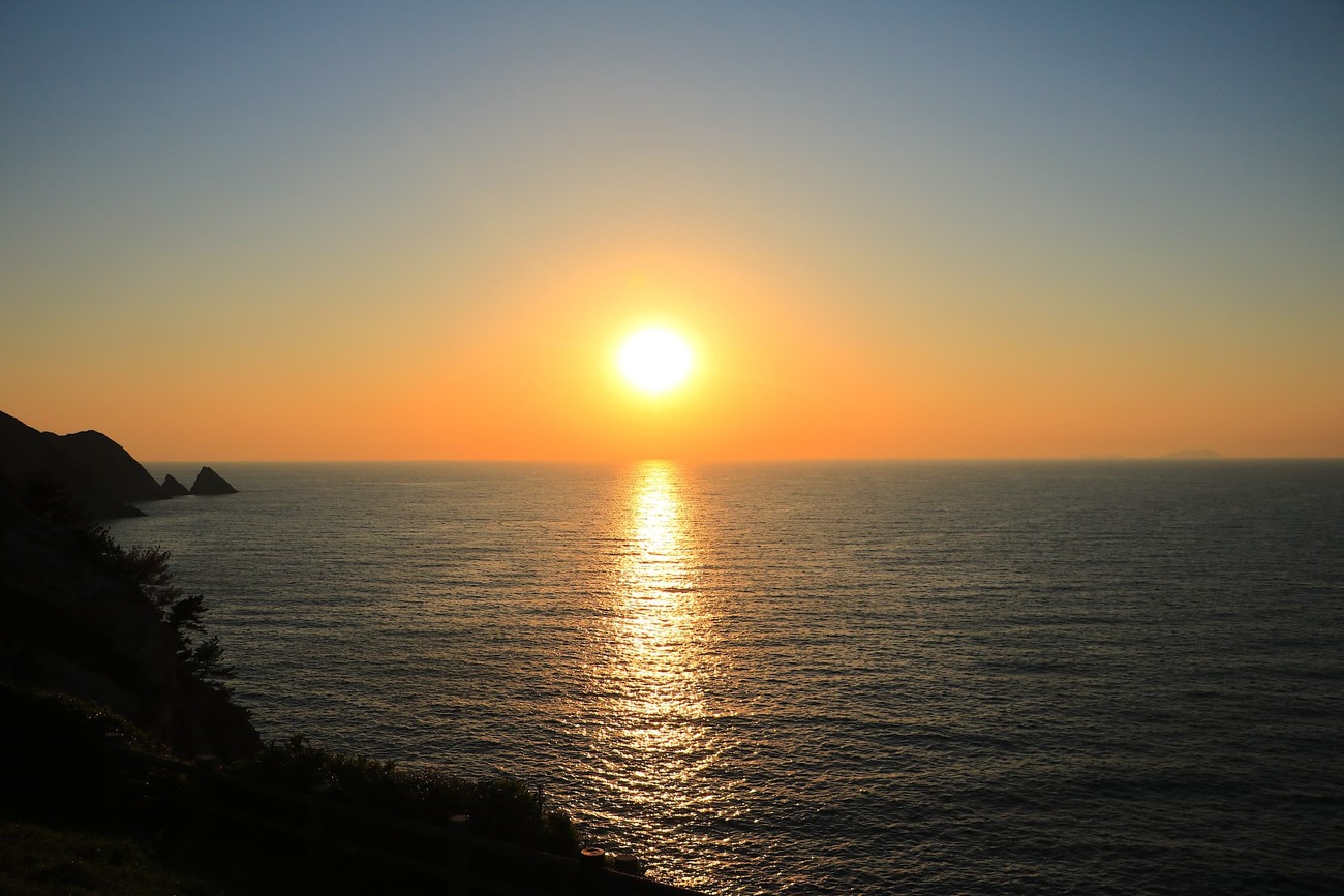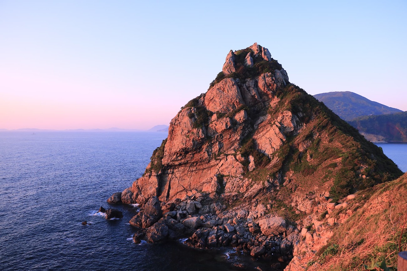 中通島の西海岸にある「矢堅目(やがため)」は、古くから海上航路の目印として親しまれてきた巨岩です。とんがり帽子のような形は、スタジオジブリ映画『となりのトトロ』のトトロが左を向いている姿に似ていると話題となり、いつしか「トトロ岩」と呼ばれるように。周辺には断崖や複雑な海岸線が連なり、迫力ある風景を一望できます。かつて敵の侵入を監視し、矢で防いだことから「矢堅目」と名付けられたこの地は、今では夕日を望む絶景スポット。水平線に沈む夕日は、五島列島ならではの雄大さで旅人を魅了し、特に夏にはオレンジ色のオニユリが咲き誇り、夕景をさらに彩ります。遠く離れた島で味わう夕日は、旅の思い出を温かく心に刻んでくれるはずです。