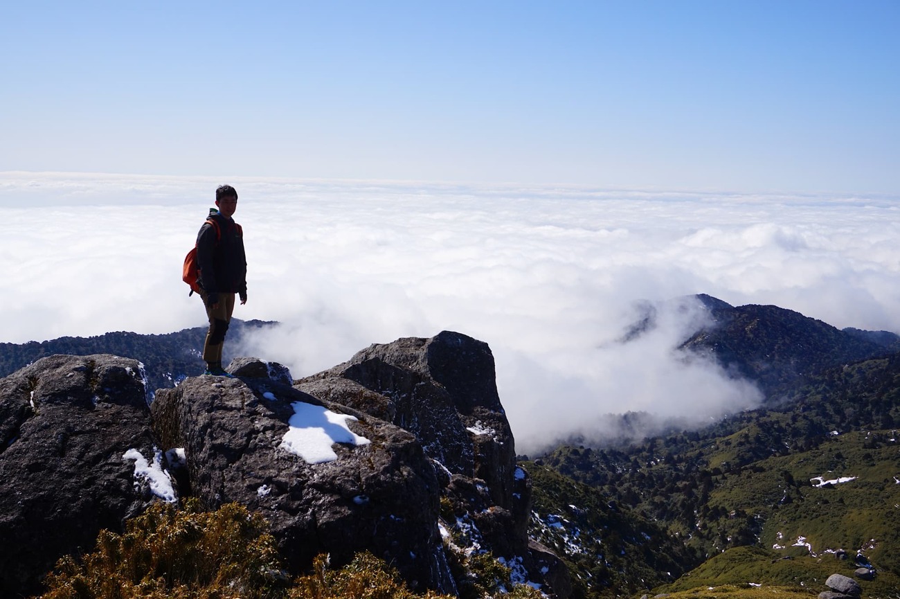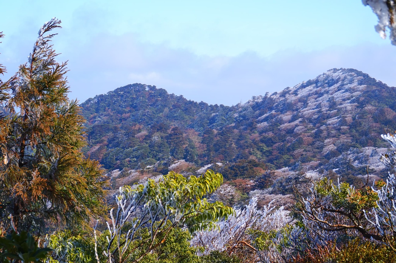 鹿児島県の南方約60km、黒潮の流れに抱かれる世界遺産・屋久島。その最高峰が、標高1,936mの宮之浦岳です。北海道・利尻山と並び「離島の高山」として知られ、島の豊かな森の源とも言われています。縄文杉のさらに奥にそびえるため、最も一般的な荒川登山口からの往復でも標準で15時間ほどを要し、日帰りは容易ではありません。筆者が登ったのは3月上旬。温暖な南国の印象が強い屋久島ですが、山頂付近には厳冬の気配が残り、枝々に咲く霧氷が見事でした。標高を上げるにつれて雪は深くなり、頂に立つと一面の霧氷原(むひょうばら)と遥かな雲海が眼下に広がります。その姿はまさに「洋上のアルプス」。太古からの自然が息づく島には、白谷雲水峡や千尋の滝、平内海中温泉など、時を超えた自然景観が点在します。宮之浦岳の頂を目指しつつ、屋久島の奥深い自然の恵みを心ゆくまで堪能してください。