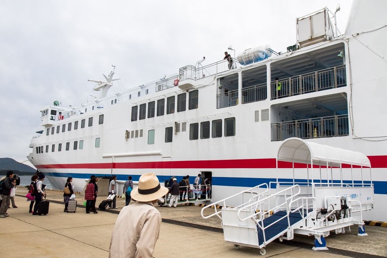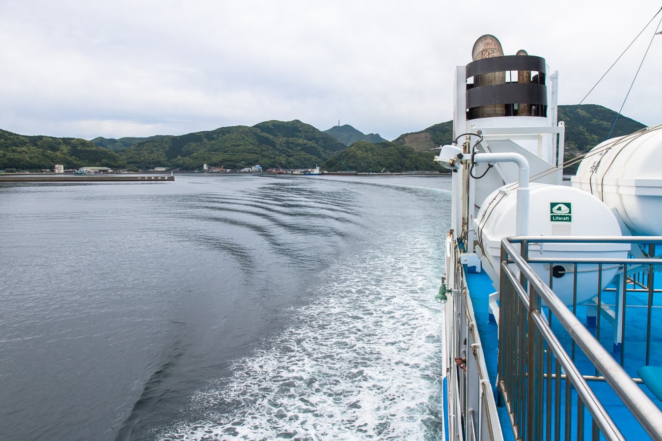 上五島の中通島からすぐ北の小値賀島へは、中通島の青方港からフェリー太古に乗船します。このフェリーは福岡県・博多港と五島列島を結ぶ航路で、博多から宇久島、小値賀島、青方港、奈留島、福江島と順に寄港していきます。青方港を12時10分に出発した船は50分ほどの船旅で小値賀島に到着。
