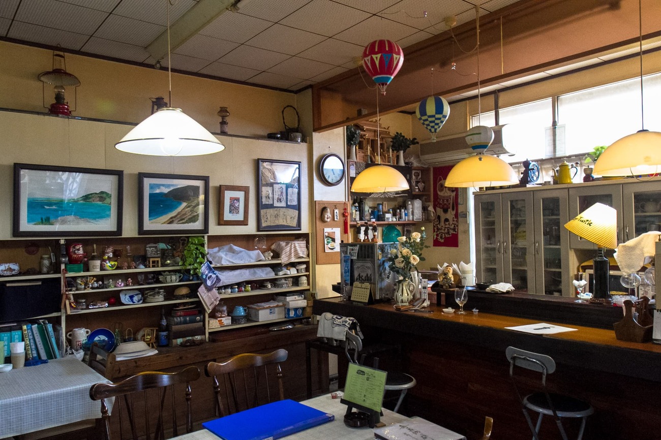 1階が喫茶店、2階が民宿の宿にチェックインしました。1階が喫茶店と聞き、きっと面白いことがありそう!という期待を胸に予約したのですが、その期待が見事に的中。ご主人のTさんは小値賀島の生き字引のような方でした。喫茶店でコーヒーを淹れてくれて、自作の地図で島のことを色々教えてくれました。明日行く予定の野崎島も「まだ人が暮らしていた頃に1年間学校の先生をしてたよ」と言うではないですか!