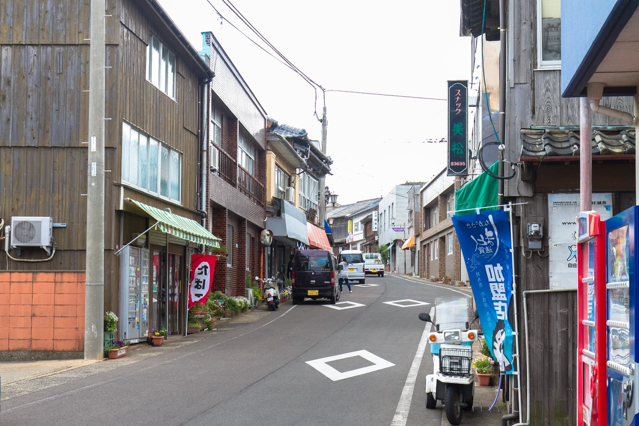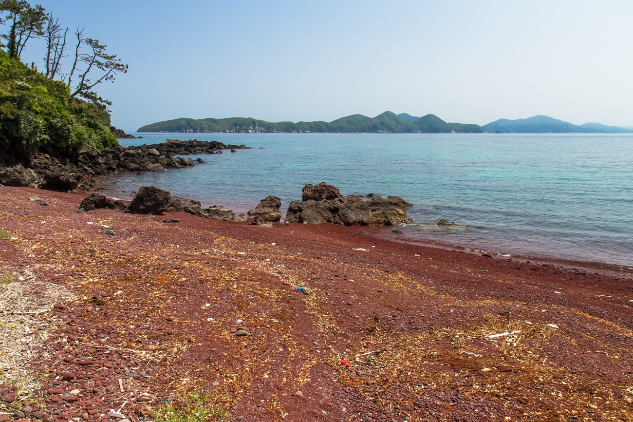 Tさんの車でまず向かったのは島南東部にある「赤浜海岸」。小値賀島は火山により生まれた島で、鉄分を多く含む火山岩由来の砂で赤く見えるのだそう。続いて、かつてクジラ漁で財を成した藤松家の家屋を改修した「古民家レストラン藤松」を見せてくれました。確かに立派で風情があります。その藤松の敷地の前に広がるのが「前方湾」。「昔、大陸へ行き来する船はこの前方湾によく停泊していたんだ。木で作った碇に石をくくりつけて海に沈め、出航する時は縄を切っていた。前方湾にはその碇石がたくさん沈んでいて、実際にここが中国への中継港として使われていたことを示しているんだ」とTさん。どこにでもある入江の風景だなと思っていたものが、急に意味をもって目の前に広がっている気がしました。