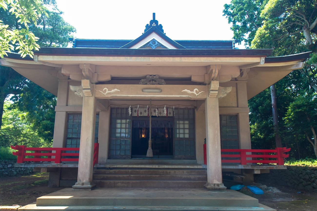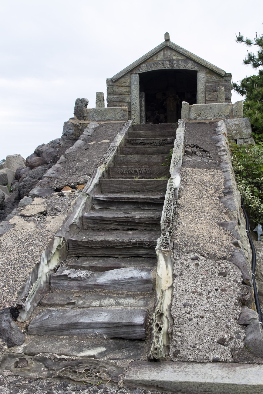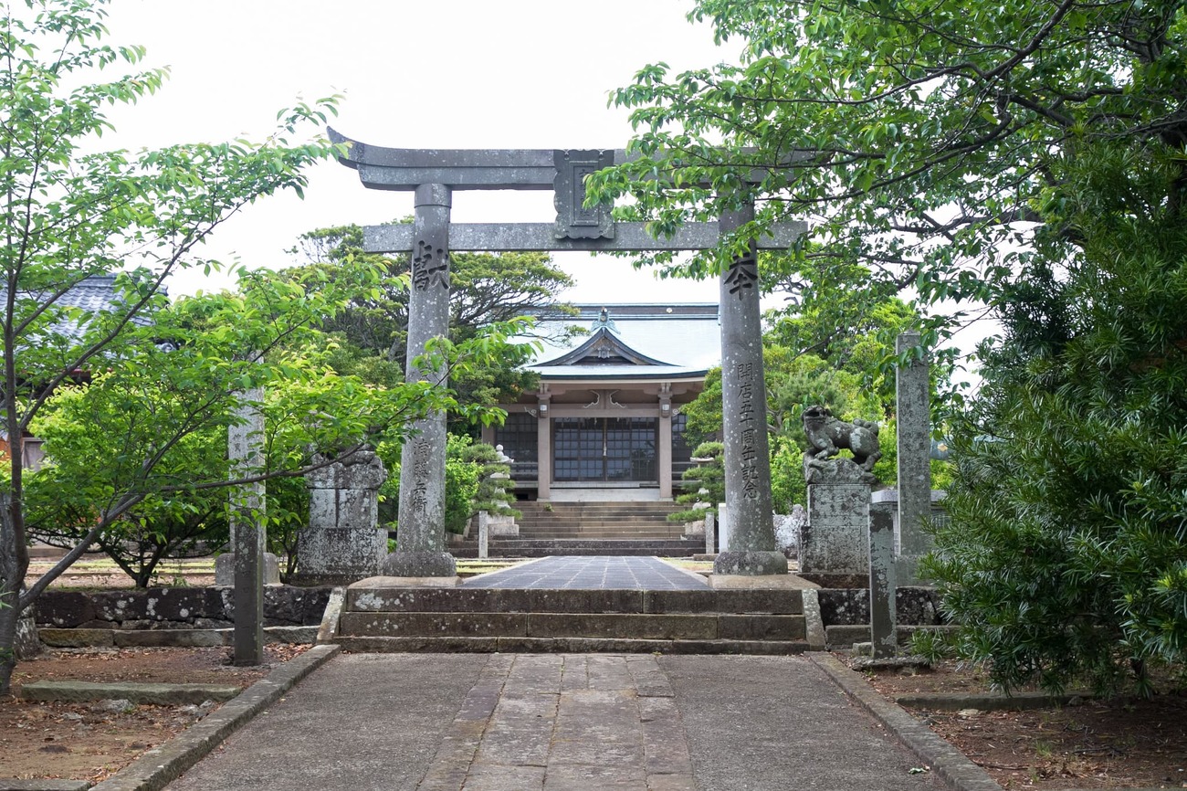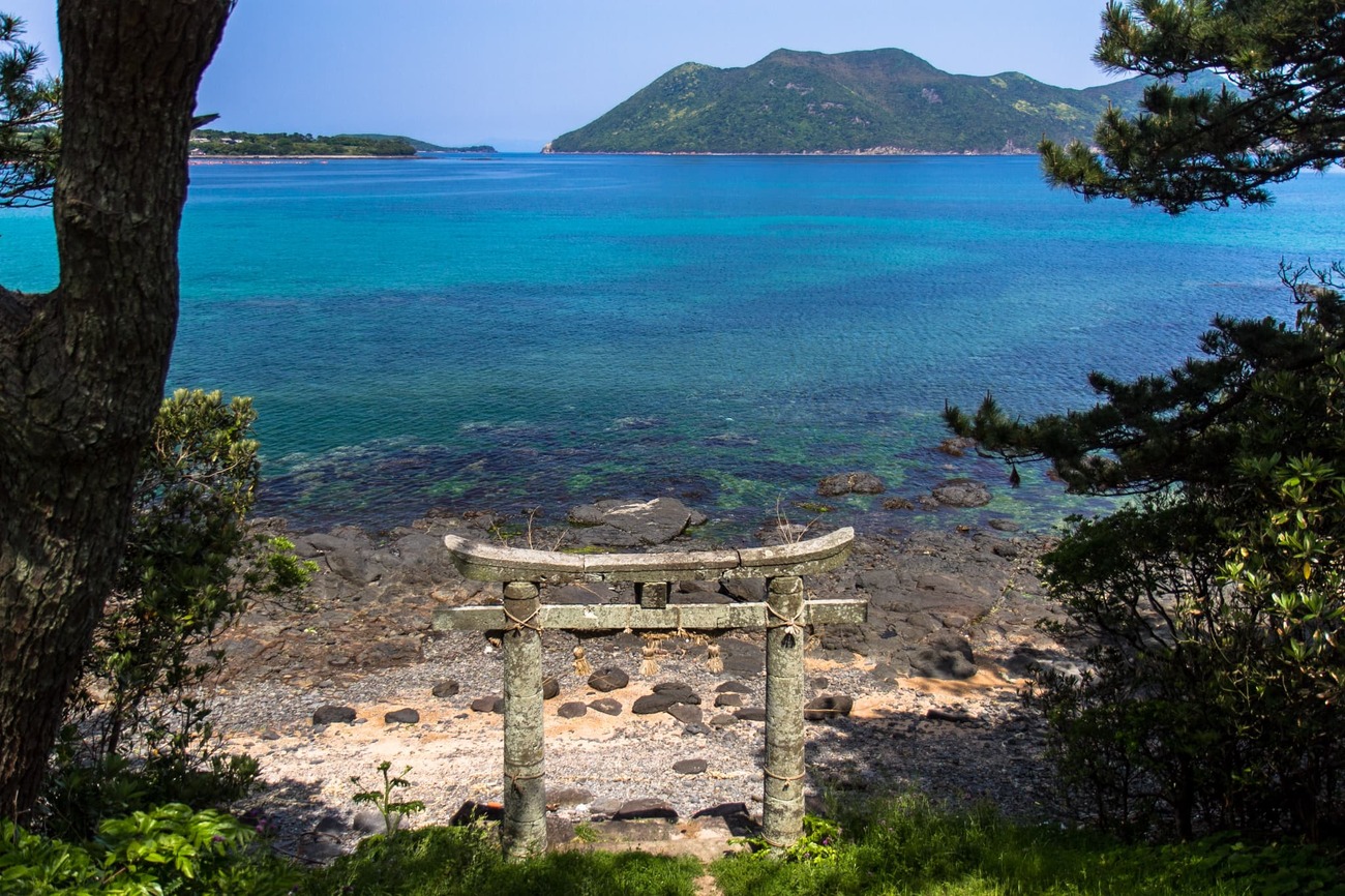 前方湾からは、明日行く予定の野崎島と、その中腹に「沖ノ神島神社」の白い屋根がかすかに見えます。沖ノ神島神社には、前方湾を経由した交易船が航海の無事を祈って多くの宝物を寄進していたそう。そんな話を聞きながら、次に向かったのはその神社と対になっている「地ノ神島神社」。沖ノ神島神社を沖津宮、ここ地ノ神島神社を辺津宮として、2社合わせて「神島神社」と呼ばれていたそうです。創建は飛鳥時代の704年と伝えられています。境内から階段で下った参道は海岸に消え、その鳥居の向こう、海を渡った先の野崎島に沖ノ神島神社があるのです。古代の航海と信仰の一端にほんの少し触れた気がしました。