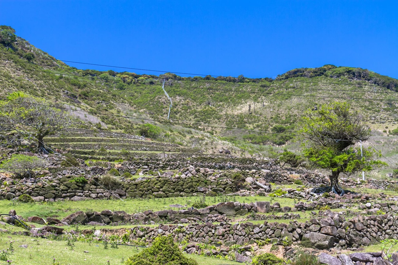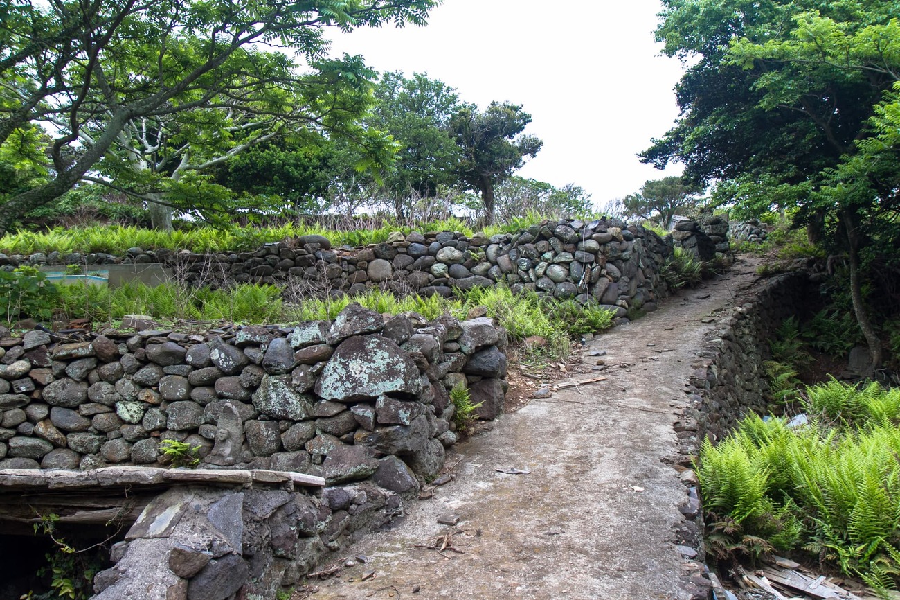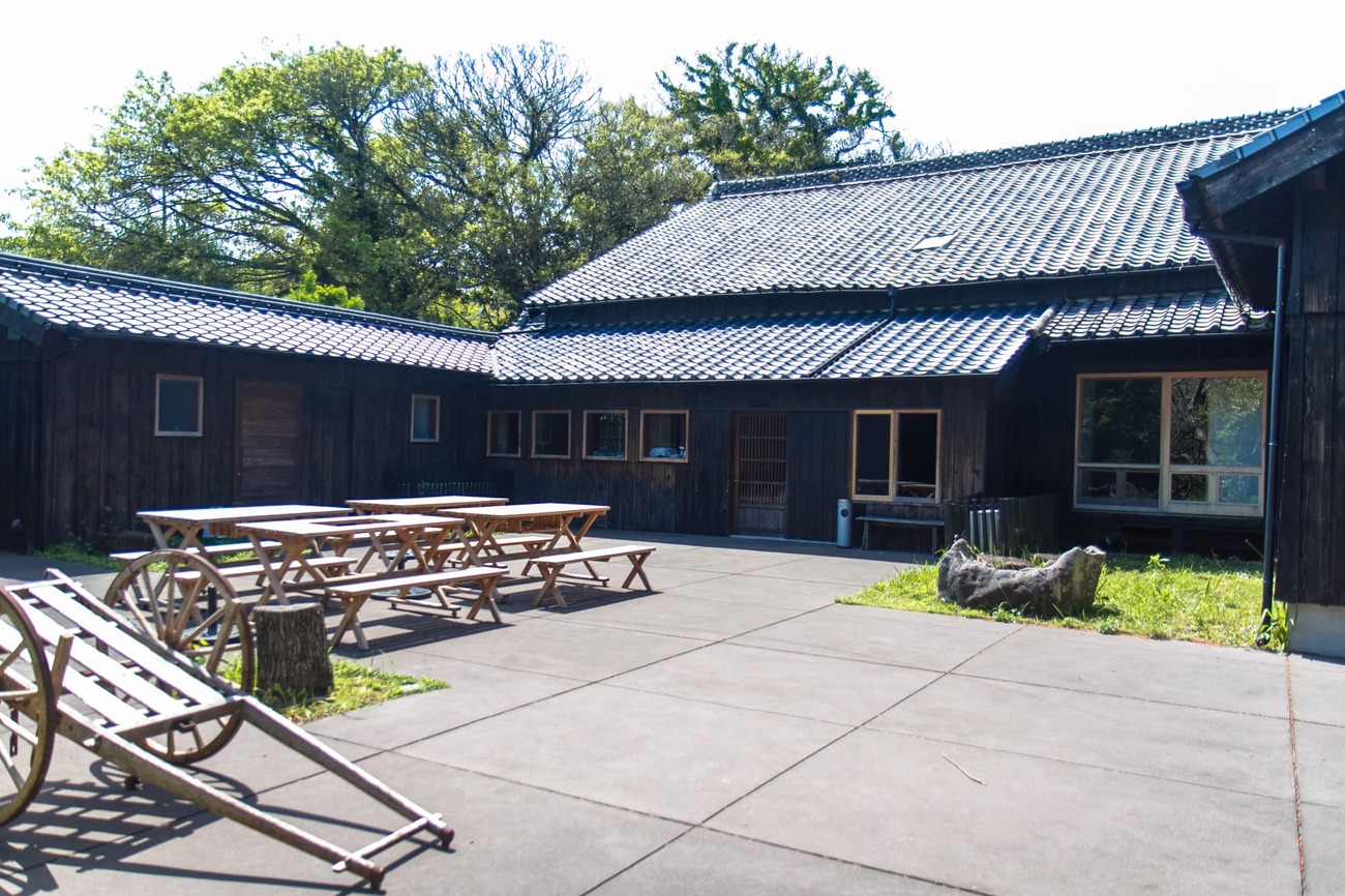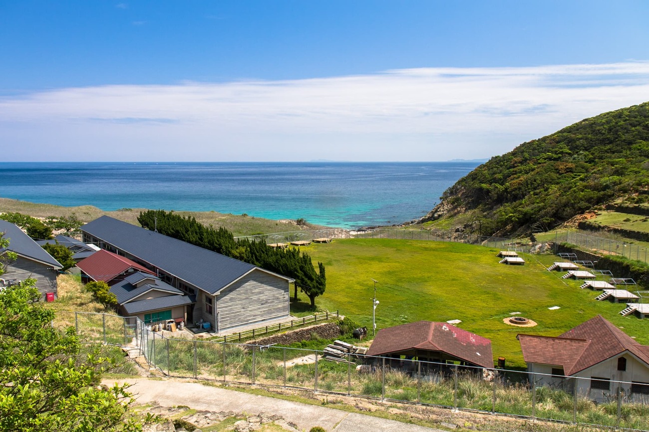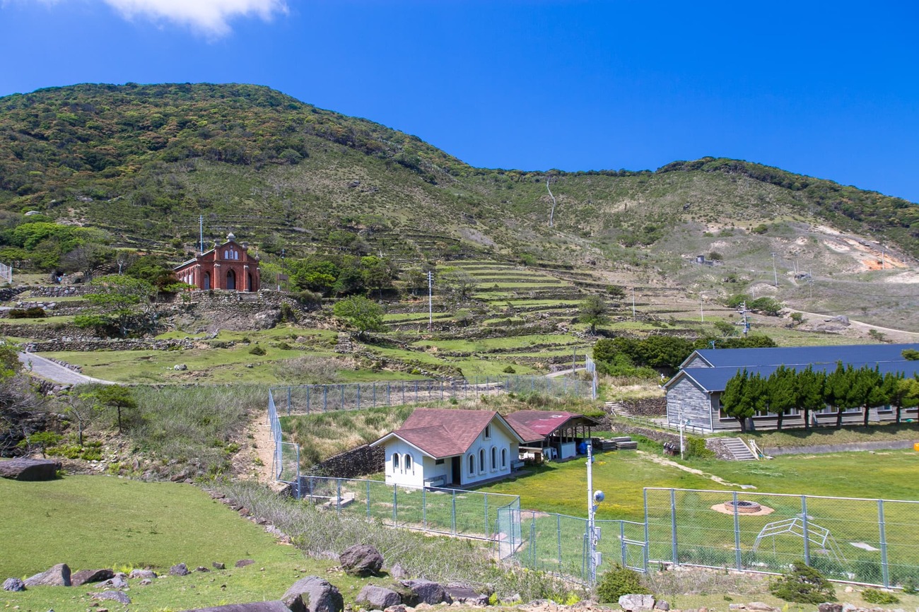 すり鉢状の盆地を見下ろす丘の上に建っているのが「旧野首教会」。「旧」の名称の通り、今は祈りを捧げる人もいない、かつての教会です。周囲の石垣は段々畑の名残で、昔は周囲に家屋がたくさん建っていたそう。手前の建物は閉校になった小中学校を改修して作られた「野崎自然学塾村」です。島を訪れる人はすでに施設使用料を払っているはずなので、ここで休憩することができます。また、申し込めば宿泊することも可能です。