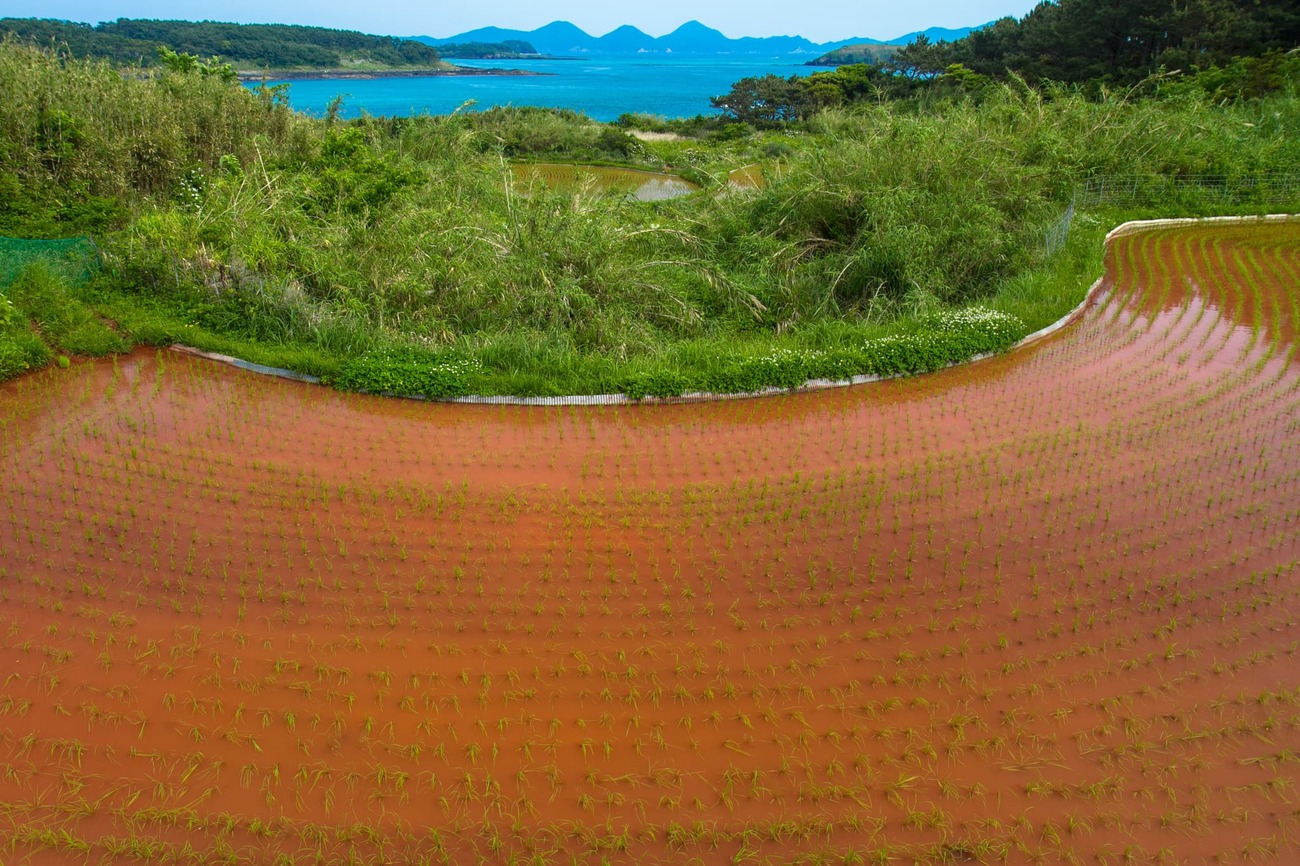 Tさんに島の話を聞かせてもらいながら、車はさらに進みます。島のゴルフ場や橋で繋がった斑島の真っ赤な田んぼなどにも立ち寄ります。やはり、島の人に教えてもらいながら見ると、なんでもない風景に歴史と文化を感じられて実に面白いのです。
