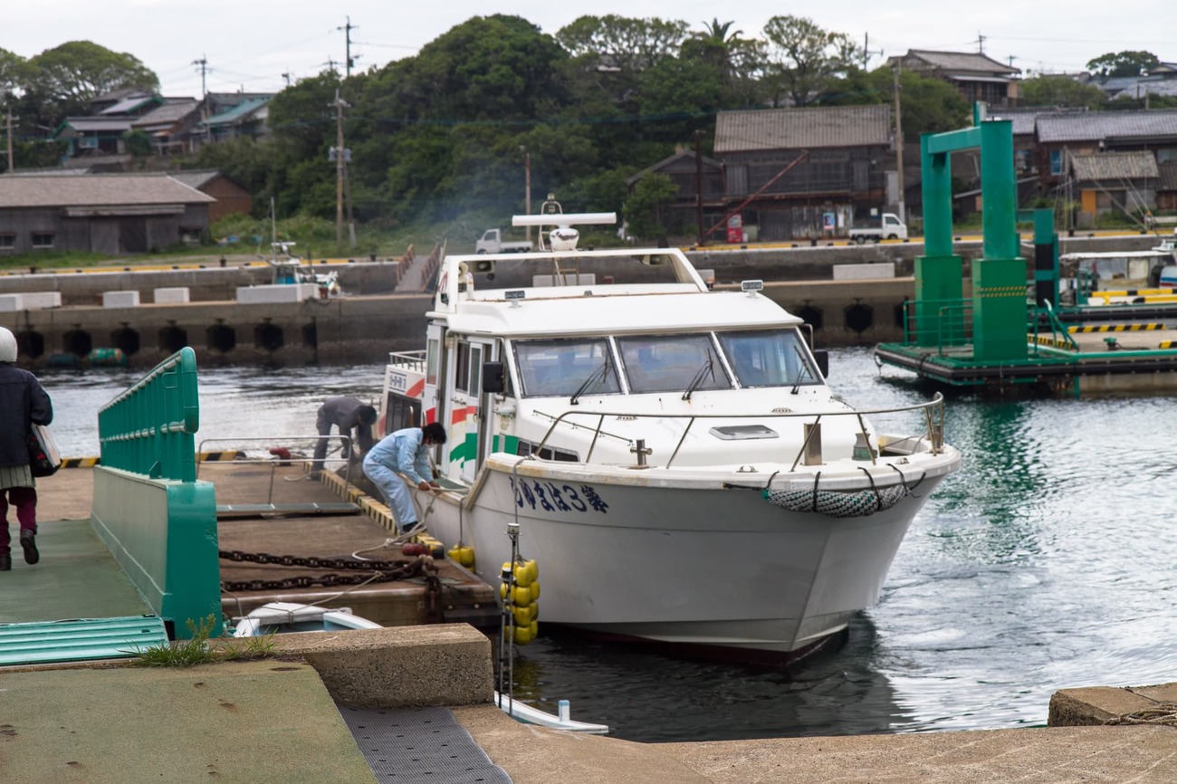 翌日は、五島列島旅のラストと決めていた野崎島へ。7時25分発の町営船「はまゆう」に乗りました。小値賀島の周りにはこの町営船で渡れる有人島がいくつかあります。小値賀島を出発した船は、六島、野崎島、大島、の順に巡航します。六島にほんの少しだけ寄港したのち、10分ほどで目的の野崎島・野崎港に到着しました。おぢかアイランドツーリズムのガイドさんから島での諸注意を聞き、各々に島内散策を開始。帰りの便は15時10分で、それまでは自由です。