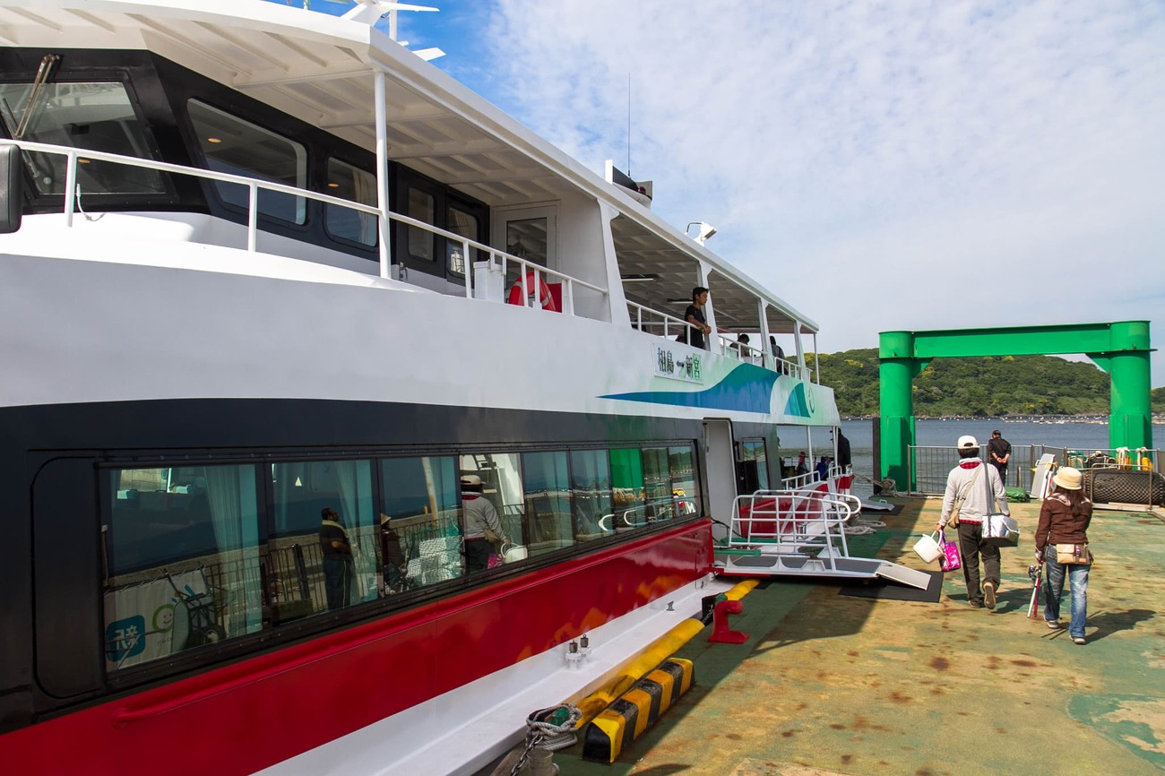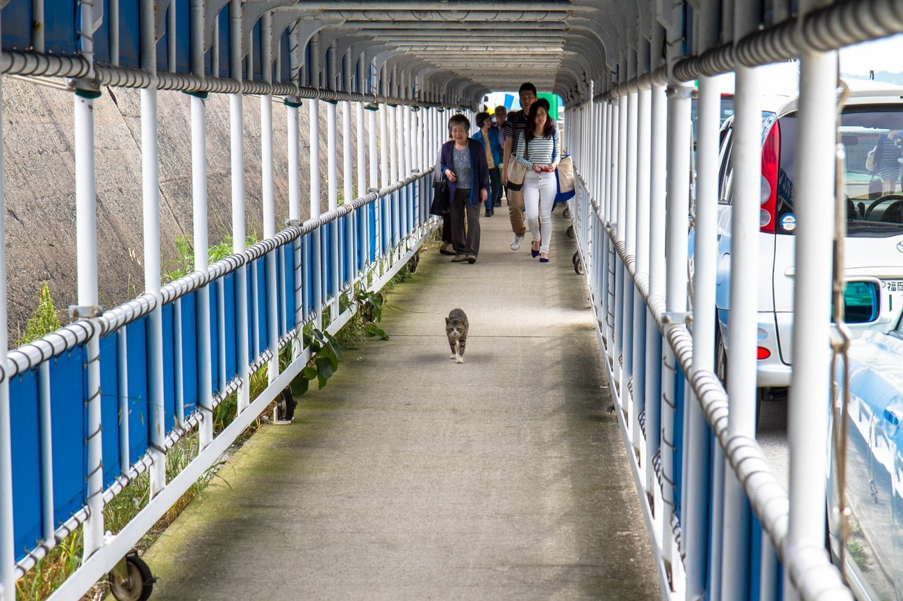 コンクリ造りの待合所で乗船券を買い、ひさしのある通路を歩いて桟橋へ。すると、ネコが1匹、下船した客を背後に引き連れて堂々と歩いてきます。「ツアーガイドかな……?」と思ってしまうほど、妙に風格があって思わず笑ってしまいました。