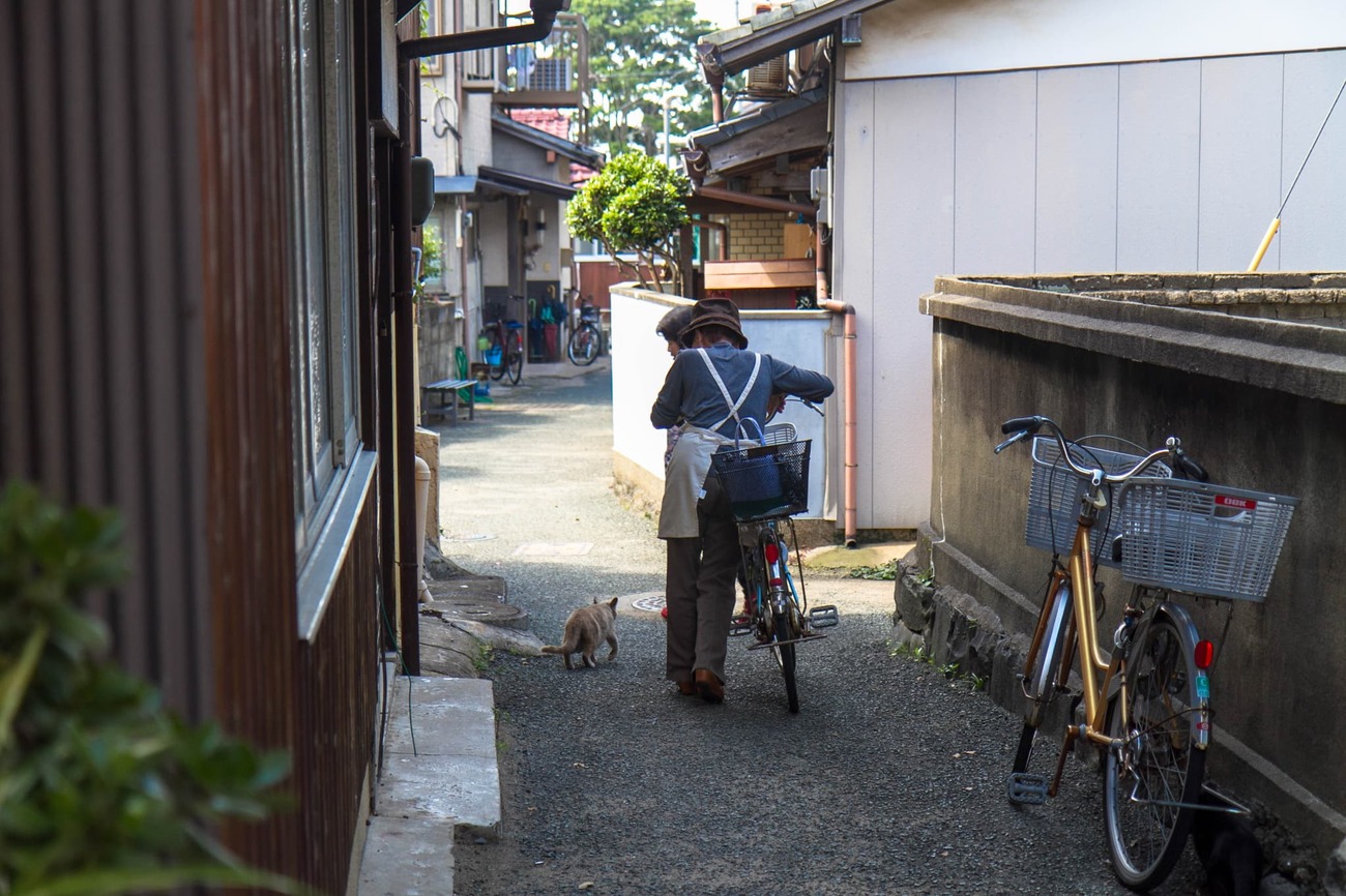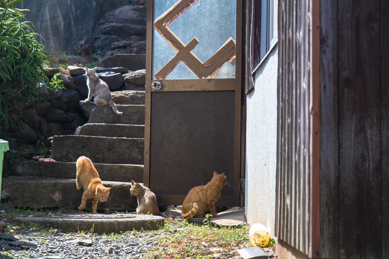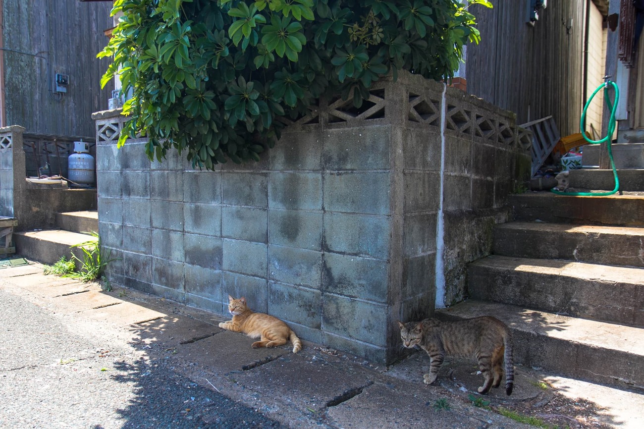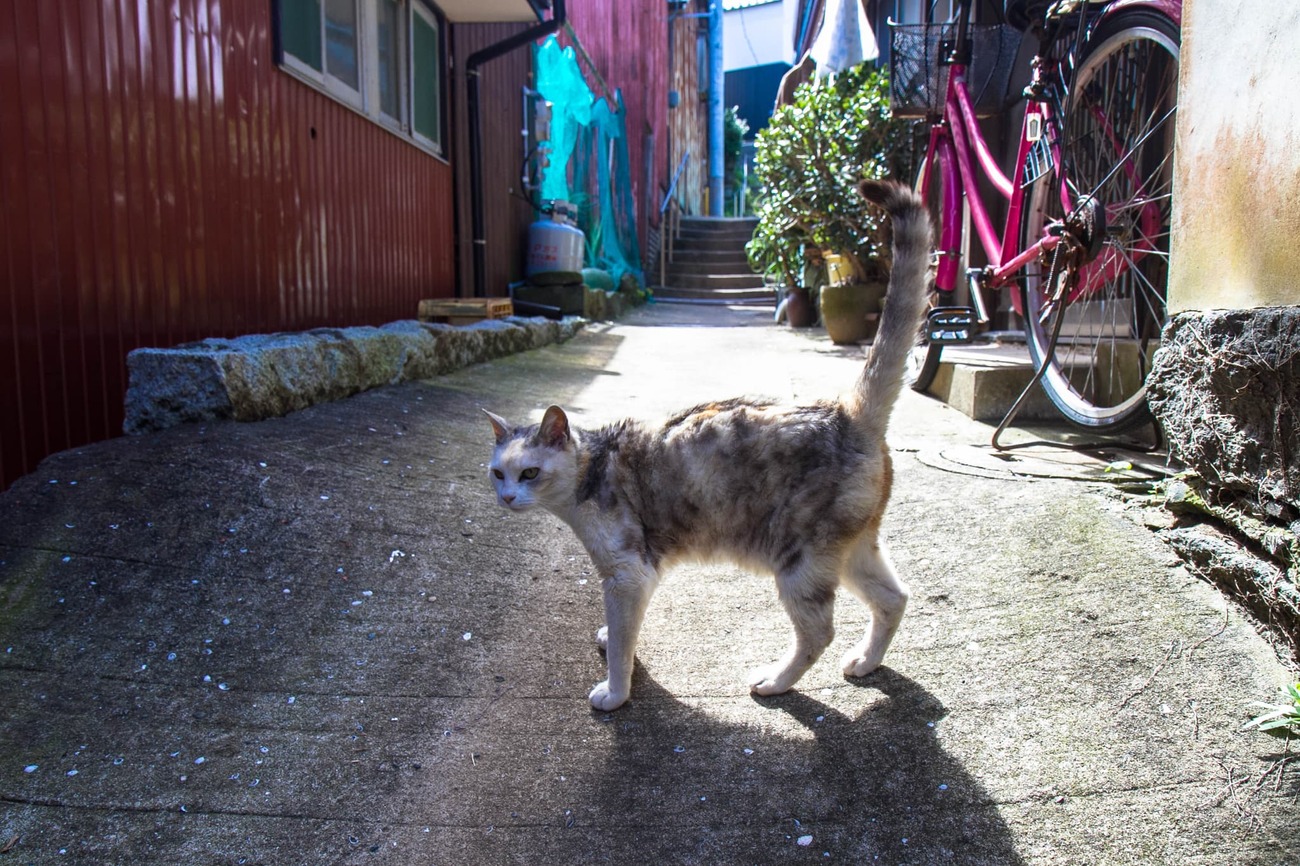 メインの通りから1本内側の道はちょっとしたたまり場になっていて、こちらが立ち止まると、わざわざ寄ってきて体をすりつけてくる子もいます。別の路地では、民家の開け放たれた戸の前にネコたちが陣取っているのが見えます。しばらくすると、さばいた魚のアラが中からぽいっと投げられ、ネコたちは喜んでくわえて去っていきました。いつもこうやってエサをもらっているんだろうな、と思えるひとコマでした。