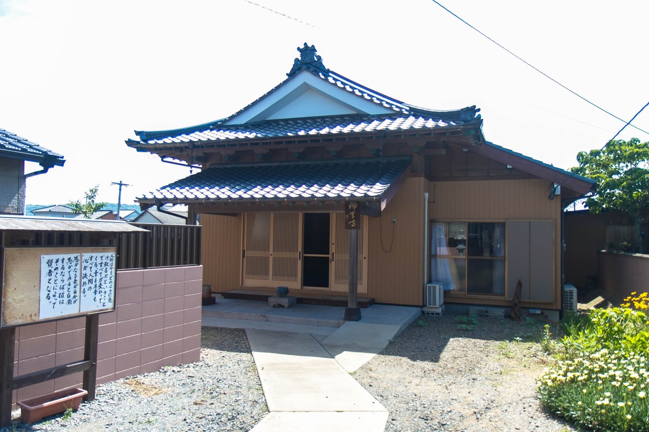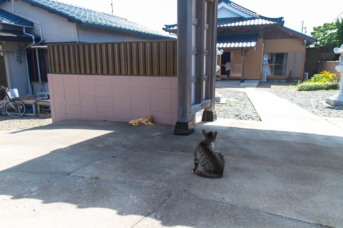「海寶山護念院神宮寺」というお寺の前を通ると、キジトラと茶トラのネコが門番をしていました。何枚か撮らせてもらってから境内へ入ると、本堂は朝鮮通信使の資料館も兼ねていて、本棚に史料がずらり。海の道とともに生きてきた相島の記憶が、お堂の静けさの中に降り積もっているようでした。