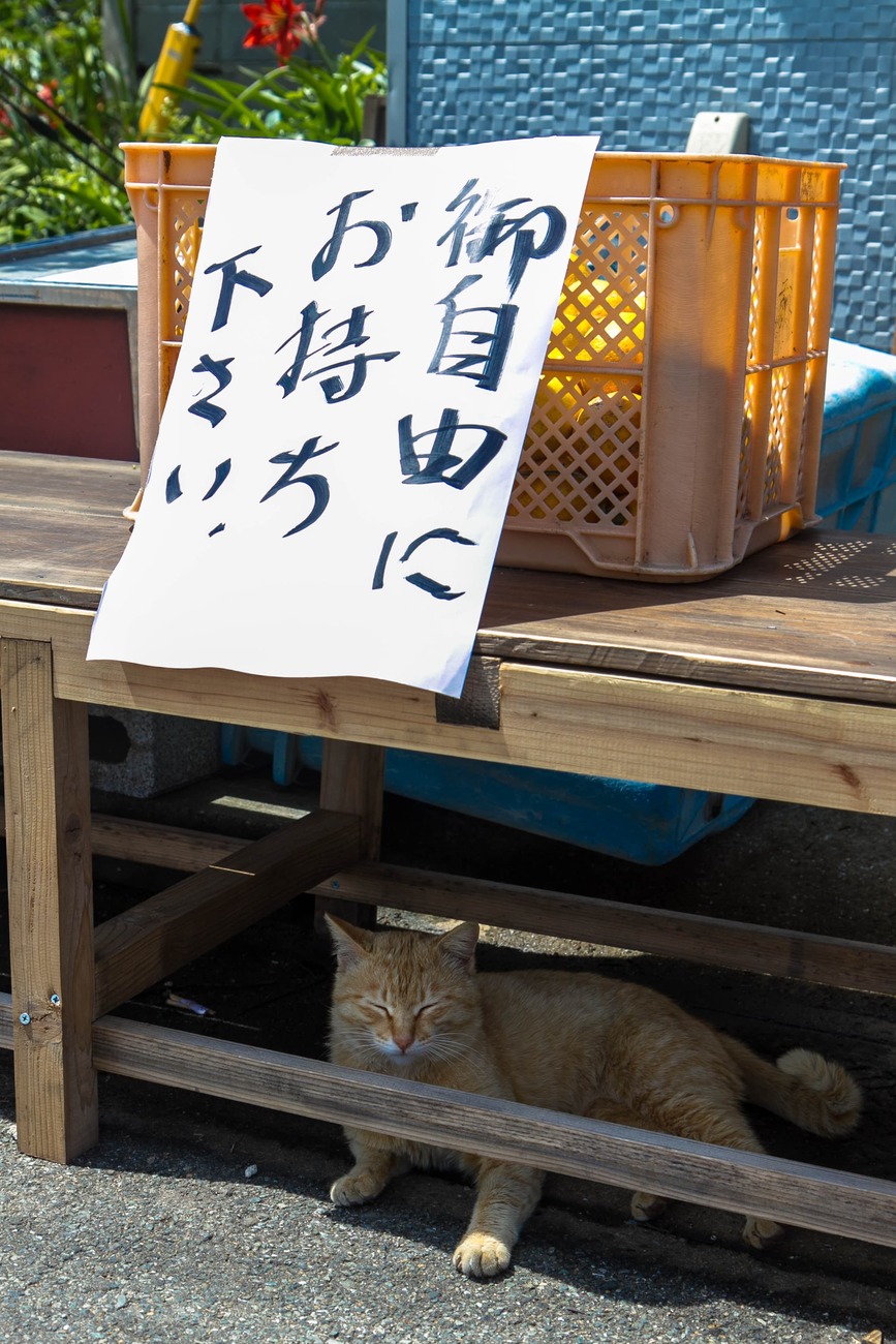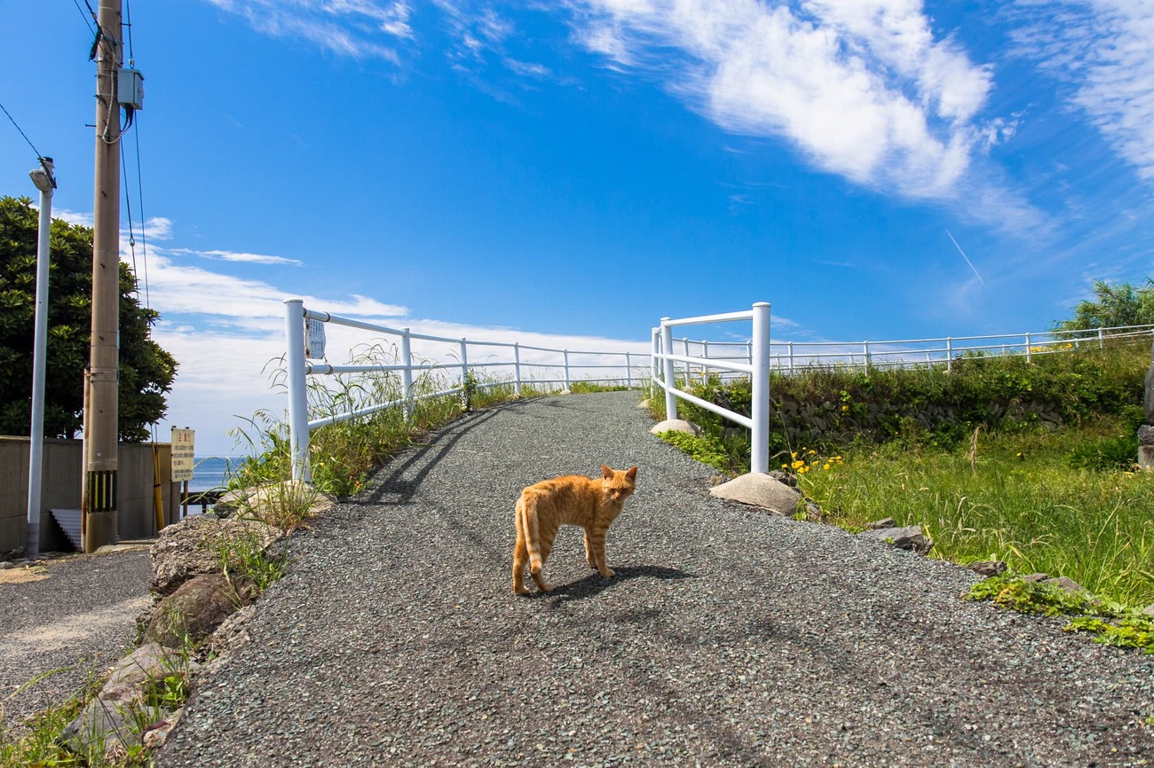 ふたたび海沿いの道へ戻ると、茶トラが日向で目を細めていたので青空をバックに1枚。島の空気が体に馴染んでくるにつれて、こちらの「ネコを探すぞ」という気負いが薄れたからか、視界のどこかしらにネコを見つけられるようになってきました。