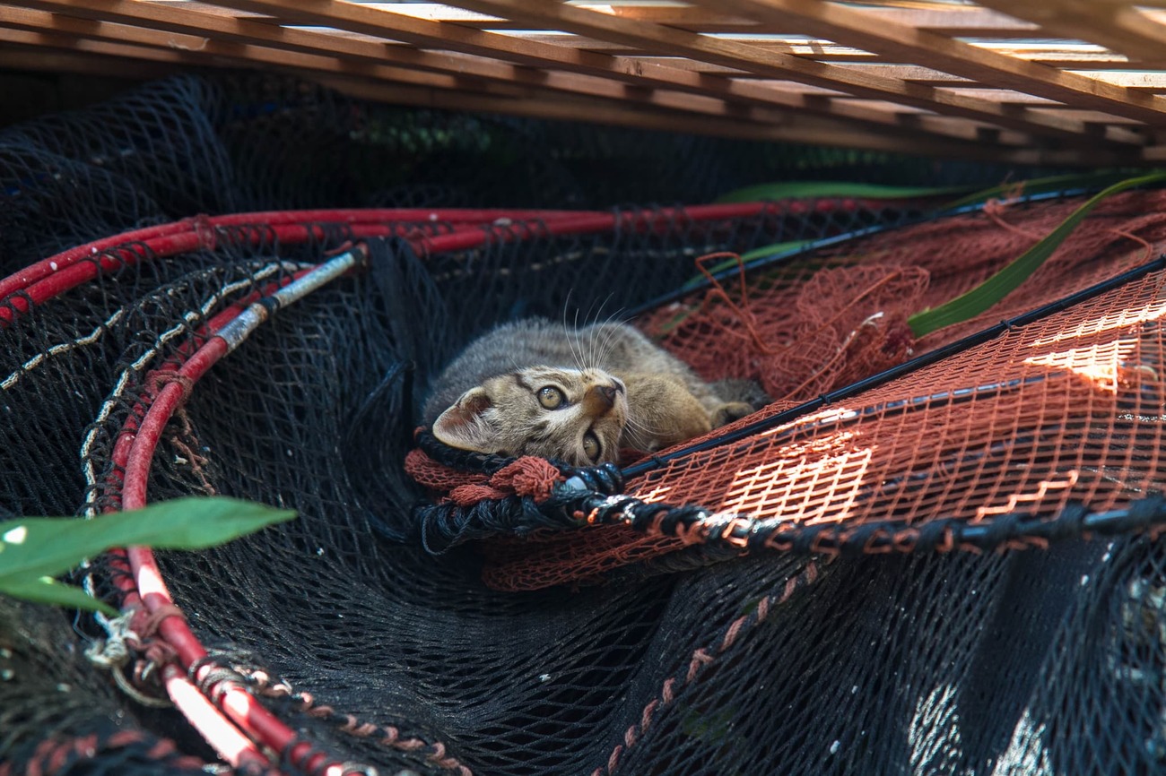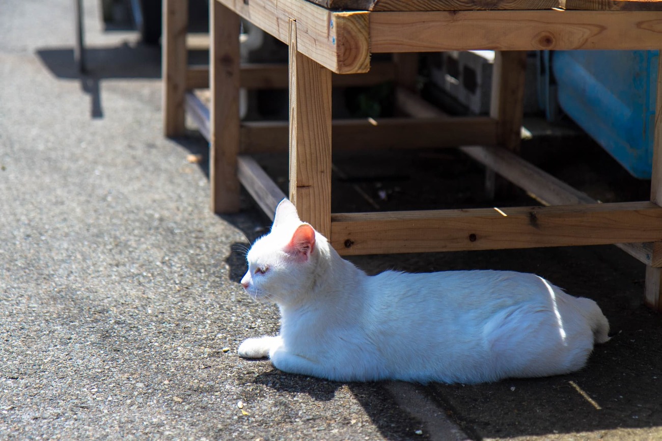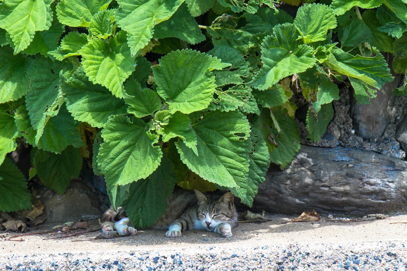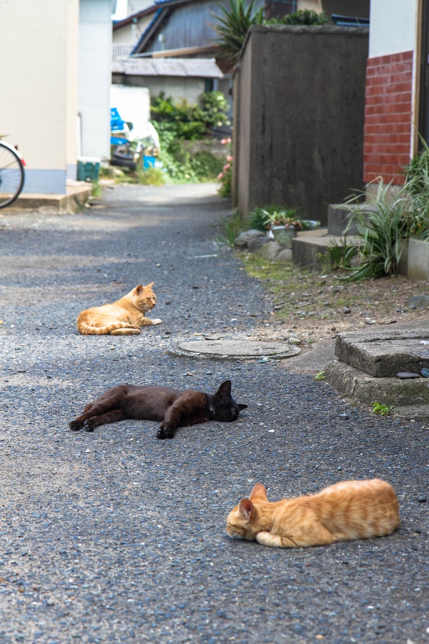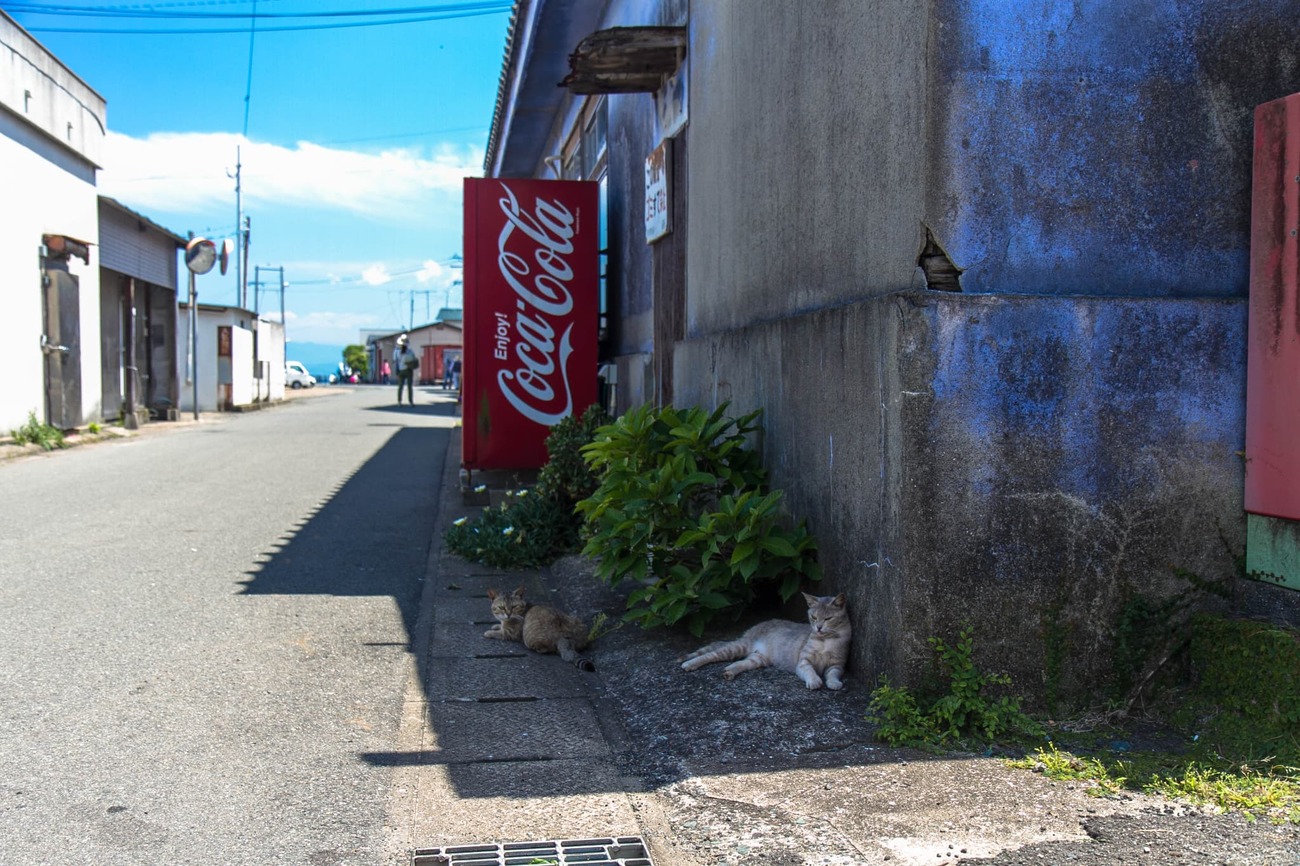 午後になると、明らかに出歩いているネコの数が増えてきました。路地では、漁網の中で子ネコがうとうとしていたり、道の真ん中でくつろいでいる子や首輪のある子もいて、飼いネコと外ネコが混ざり合う風景もこの島ならではでしょう。
