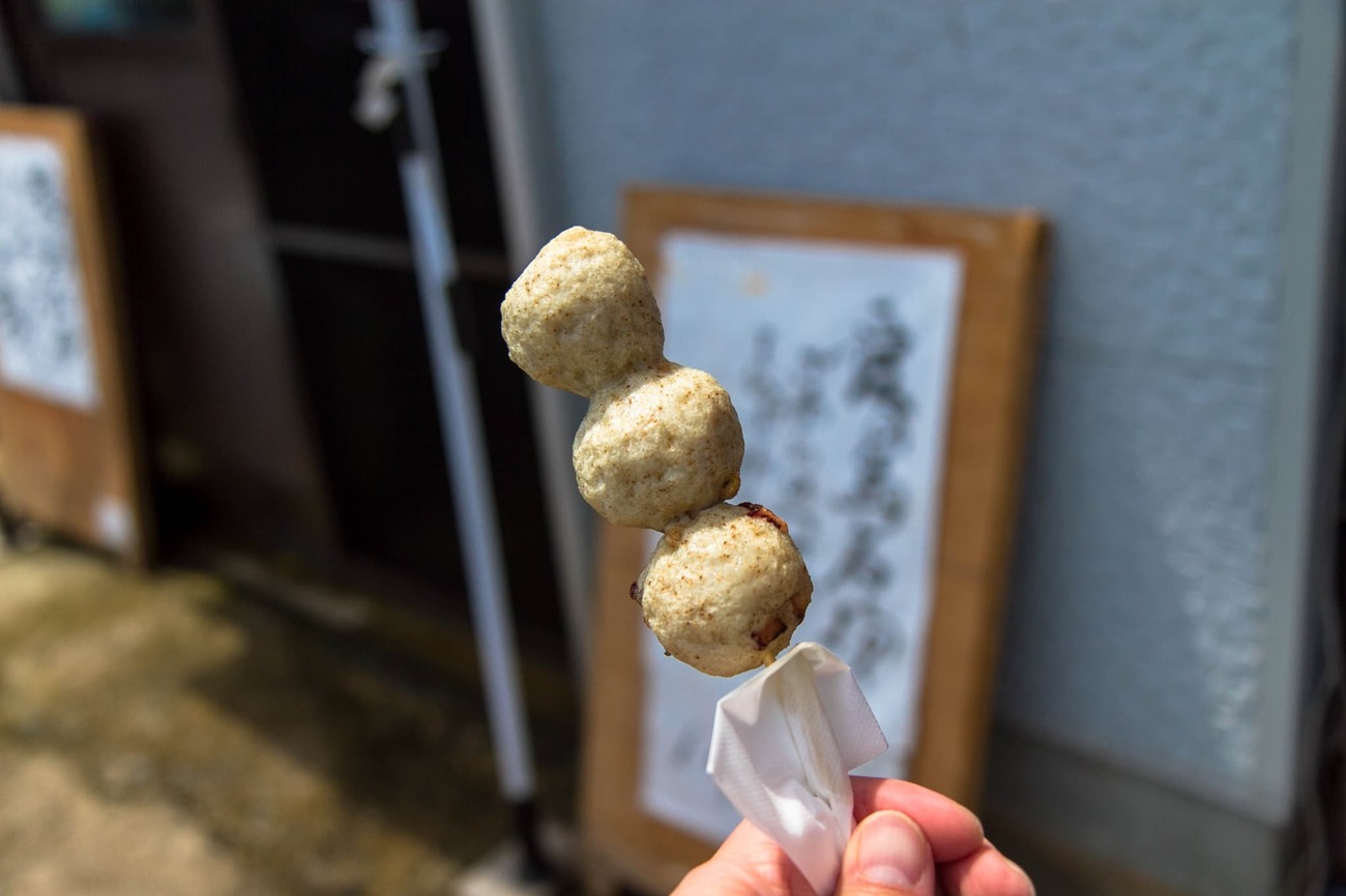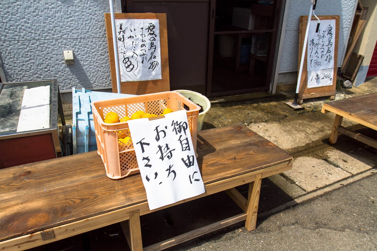 甘夏を堪能していると、そばの看板に「愛の島(※)名物さわらのつみれ いかたこ入り 美味しいよ 1串200円」の文字が目に入ってきました。せっかくなので相島の幸をいただくことに。店の奥に声をかけると、中ではウニの殻むきをしている最中。漁で揚がったものをさばいたり、つみれやかき氷を売っているお店のようでした。甘夏のカゴの下には、いつの間にかネコが休んでいます。
