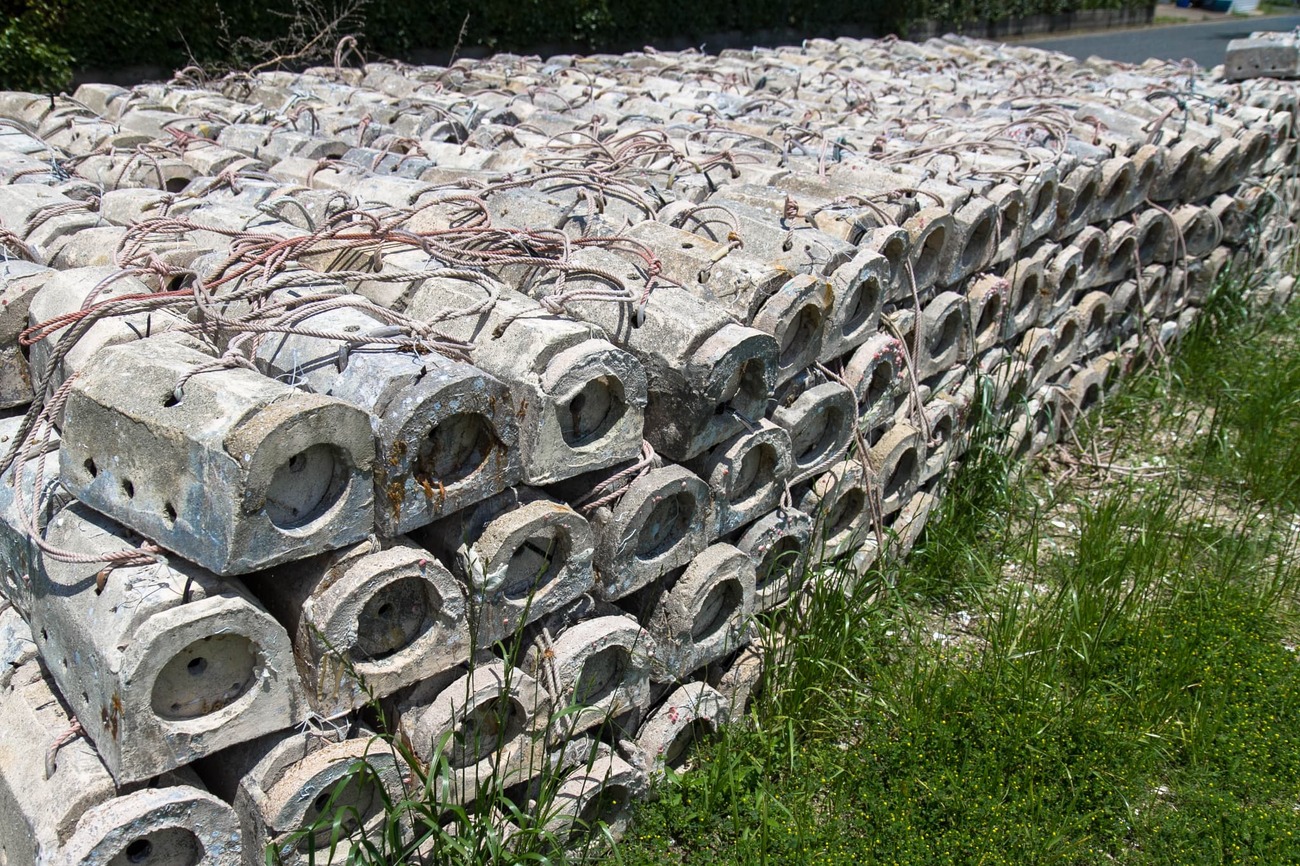 港から東へ歩くと小学校があり、さらに先に行くと「相島積石塚群」の看板が立てられていました。低木に囲まれた脇の小径に入りしばらくすると、海を望む石の原が視界いっぱいに広がりました。想像していた規模と違いすぎて、思わず足が止まるほどです。赤く塗られた杭が点々と刺さり、それぞれが古墳の位置を示しています。1992(平成4)年の学術調査で、4〜7世紀の古墳群と判明、その数は254基にもなるのだとか。