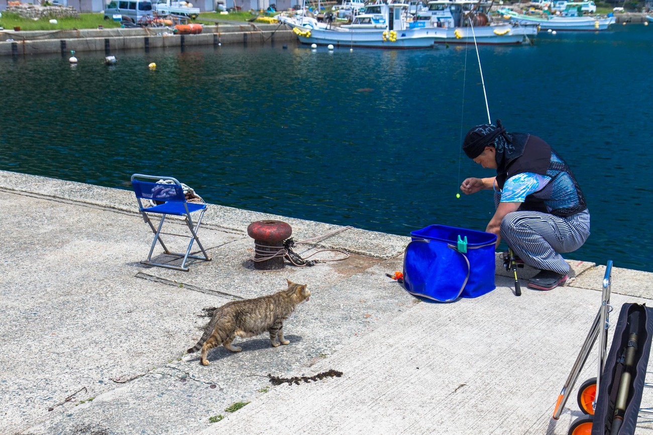 お昼には少し早いのでまたあとで来ることにして、隣の相島購買店で日用品の棚を眺めてから、海沿いを北へ。岸壁には釣り人、空き地にはタコ壺。歩いていると向こうからネコが寄ってきます。釣り人のそばにも数匹、釣果のおこぼれをもらえるのを知っているのでしょう。みな毛並みがよく、ほどよくふっくら。釣り人のほうも慣れたもので、邪険にせずそのまま釣りを続けています。