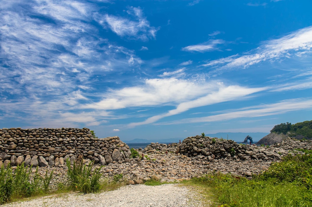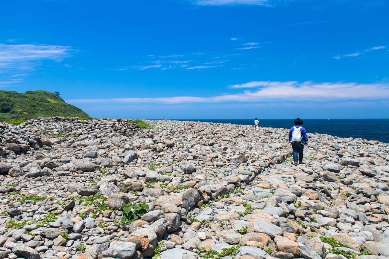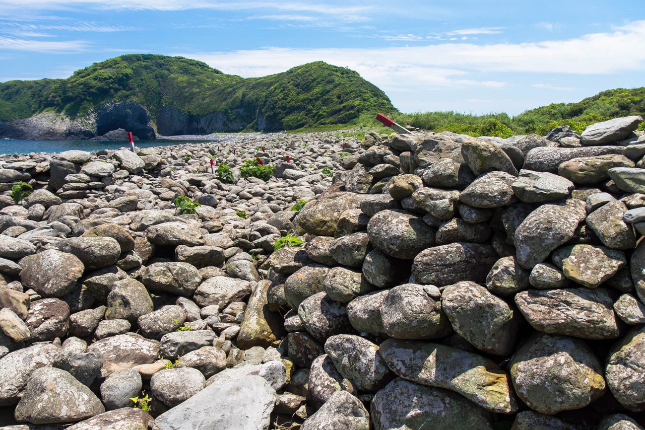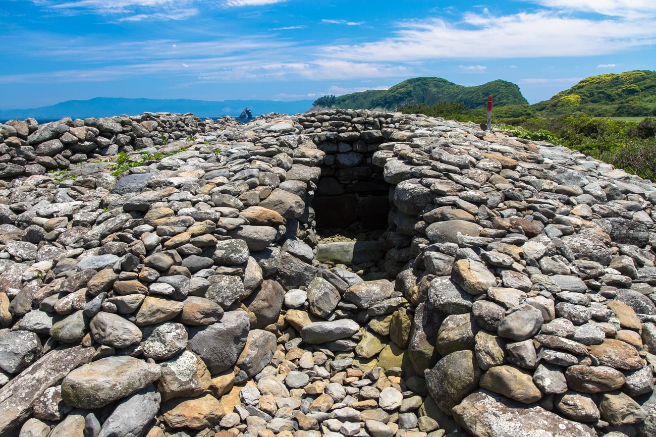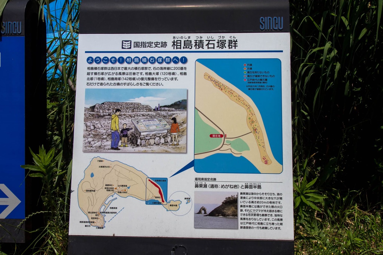 方墳と円墳が半々で、竪穴や横穴などさまざまな形式のものがあるそうです。これら積石塚群は、その貴重さから国指定史跡となっています。広大な石の海岸には石で仕切られた見学路があり、奥まで歩くと積石塚群で1番大きな石積の円墳があります。発見時にはすでに盗掘されていたそうですが、中から見つかった土器は朝鮮半島との繋がりも示すものだと考えられています。朝鮮通信使時代の遥か昔から、大陸との中継地だったのでしょう。7世紀まで使われていたということは、1400年前にこの場所で石を積み上げた人々がいたのです。そう思うとロマンを感じずにはいられません。
