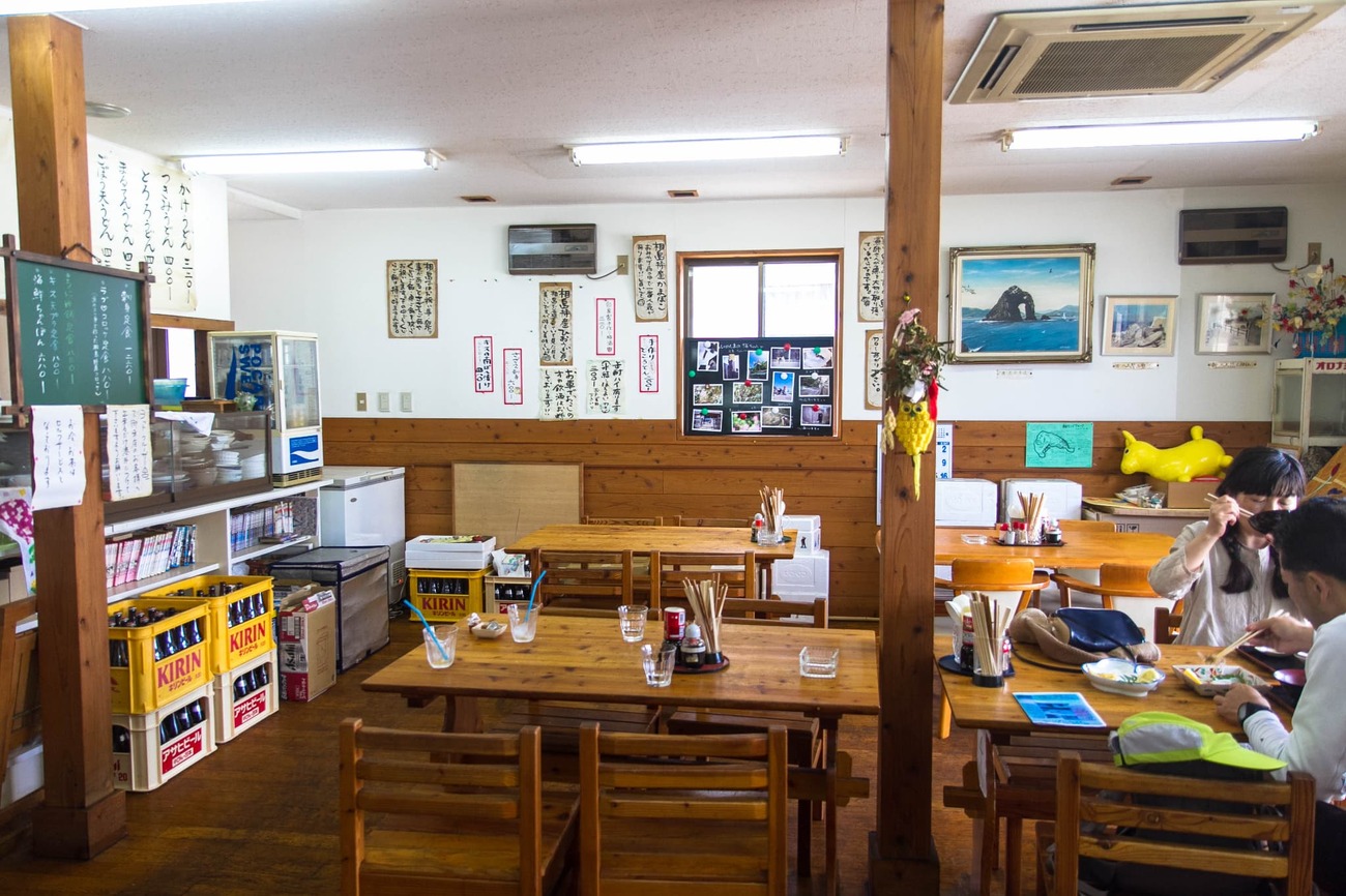 海風を受けながら港へ戻る道すがら、たくさんのネコを見かけました。島には宿もあるようで、1泊すればのんびりした空気が存分に味わえそうだな、と考えながら歩いていると、時刻はすでに13時過ぎ。先ほど覗いた「丸山食堂」に入ります。壁のメニューには、うどん、海鮮ちゃんぽん、刺身定食、キス天ぷら定食、などいろいろ並んでいます。