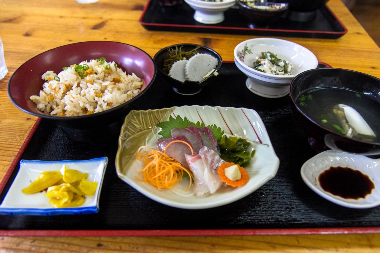 さっき店の前を通った時に張り出されていた「うにご飯」が頭から離れなかったので、迷わず注文。島のウニを一緒に炊き込んだ香りのいいご飯に、地魚の刺身やかまぼこ付き。追加の刺身も頼みましたが、夢中で食べて名前を忘れてしまったのが悔しい。ちなみにこの食堂、土日営業かつ11〜17時と通しで開いています。島ではランチ難民になりがちなので、旅人からしても、とてもありがたいです。