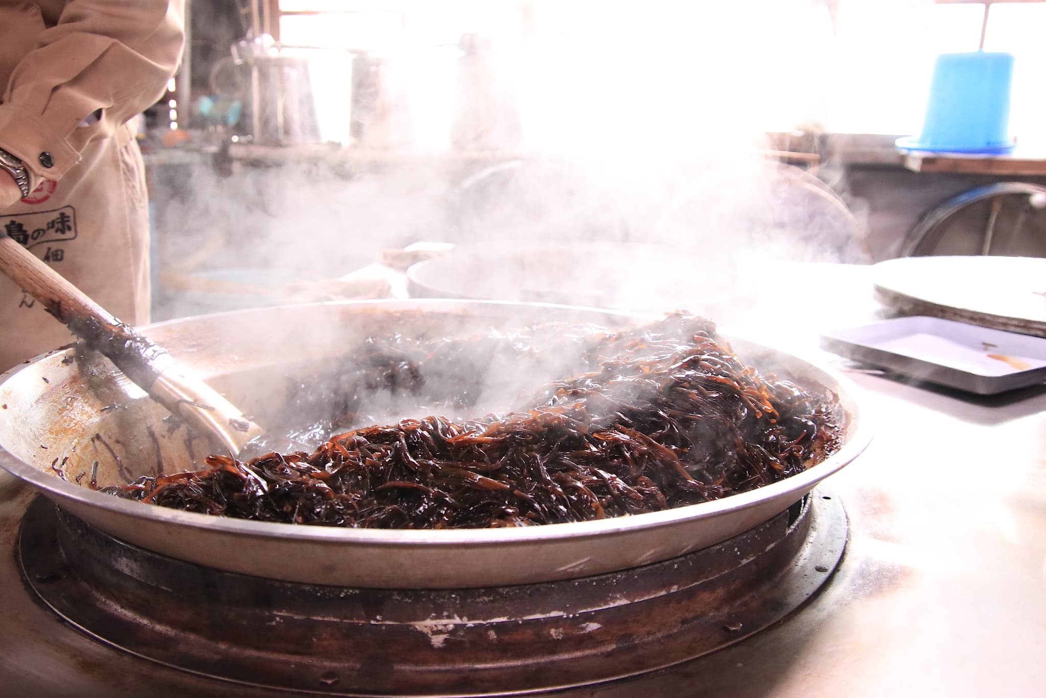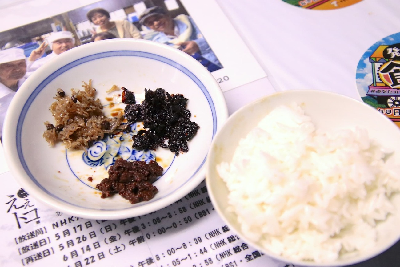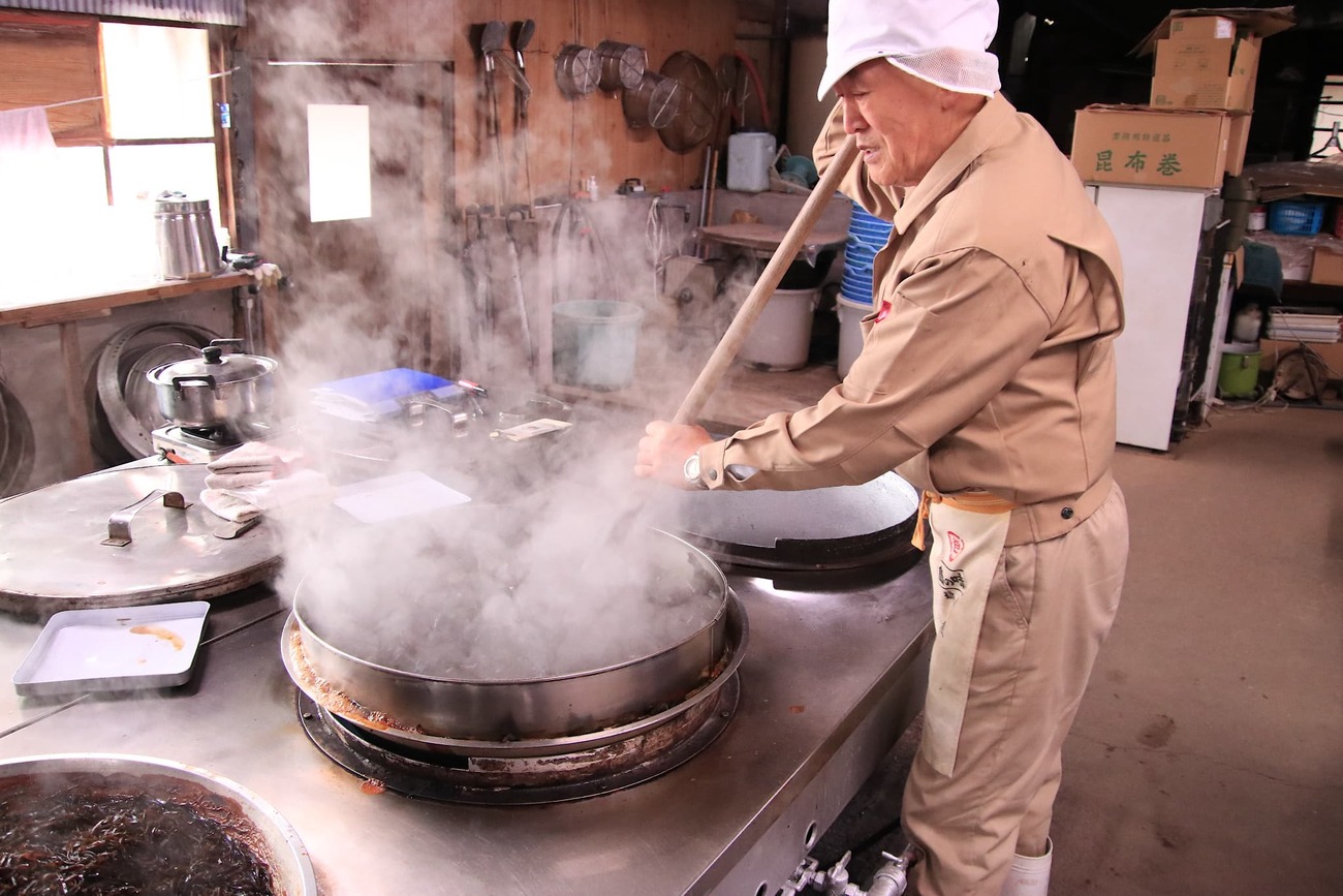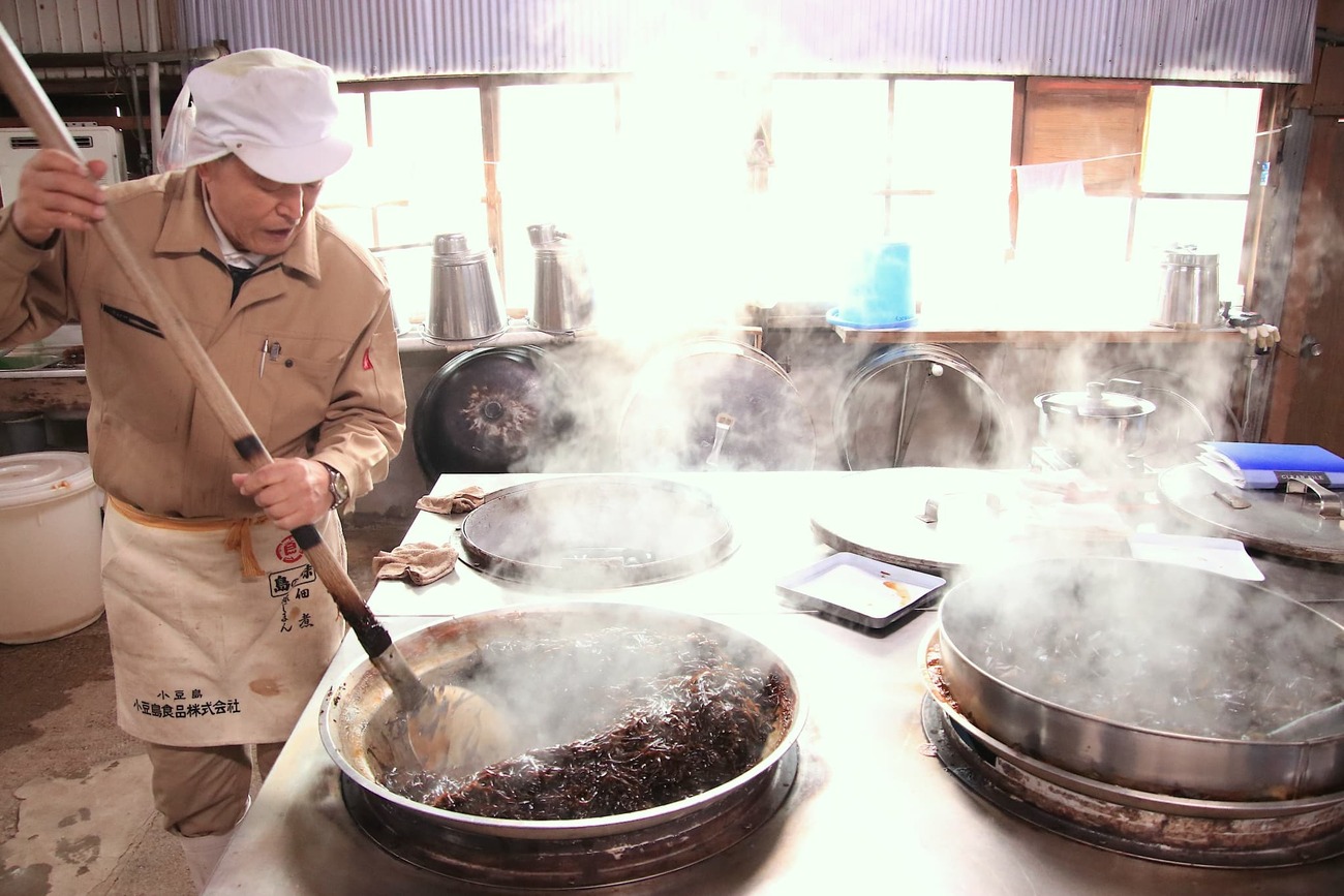 島の静かな集落に佇む「小豆島食品」は、創業からおよそ70年、昔ながらの手づくり製法を守り続ける佃煮の老舗です。現在は4代目・久留島克彦さんが舵を取り、伝統を受け継ぎながらも、新しい味づくりにも挑戦しています。使用する素材は、同じ島で仕込まれるヤマロク醤油の「鶴醤」をはじめ、鹿児島・枕崎産の鰹節や、奄美諸島・喜界島の砂糖など、全国から厳選された逸品ばかり。余計な添加物を加えず、素材本来の旨みを引き出すのが小豆島食品のこだわりです。扉を開けると、木の香りと醤油の香ばしさが混ざり合う、どこか懐かしい空気が漂います。レトロな雰囲気の工場では、平釜でじっくり炊き上げる佃煮づくりの様子を見学可能。炊きの工程では、克彦さんが2時間以上かけて木べらで絶えずかき混ぜ、味を均一に仕上げていきます。その姿からは、島の風土に根ざした職人の誇りと温もりが伝わってきます。見学の後には、できたての佃煮を試食できる嬉しい体験も。持参したパックライスを工場内にある電子レンジで温めて、熱々のご飯の上にのせて一口食べれば、素材の旨みと優しい甘辛さが口いっぱいに広がり、箸が止まりません。小豆島食品の佃煮は、少量生産のためここでしか買えないものも多く、一度味わうと忘れられずに郵送で取り寄せるファンも多くいます。伝統と真心が息づく味わいは、まさに“小豆島の宝”と呼ぶにふさわしい逸品です。