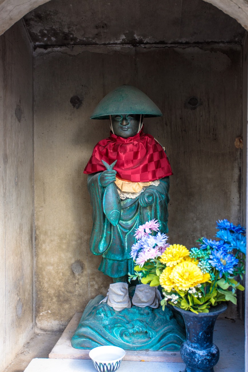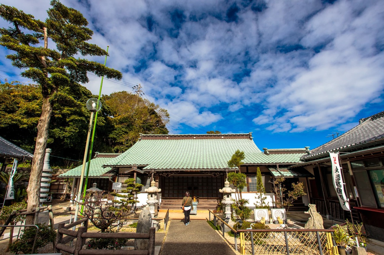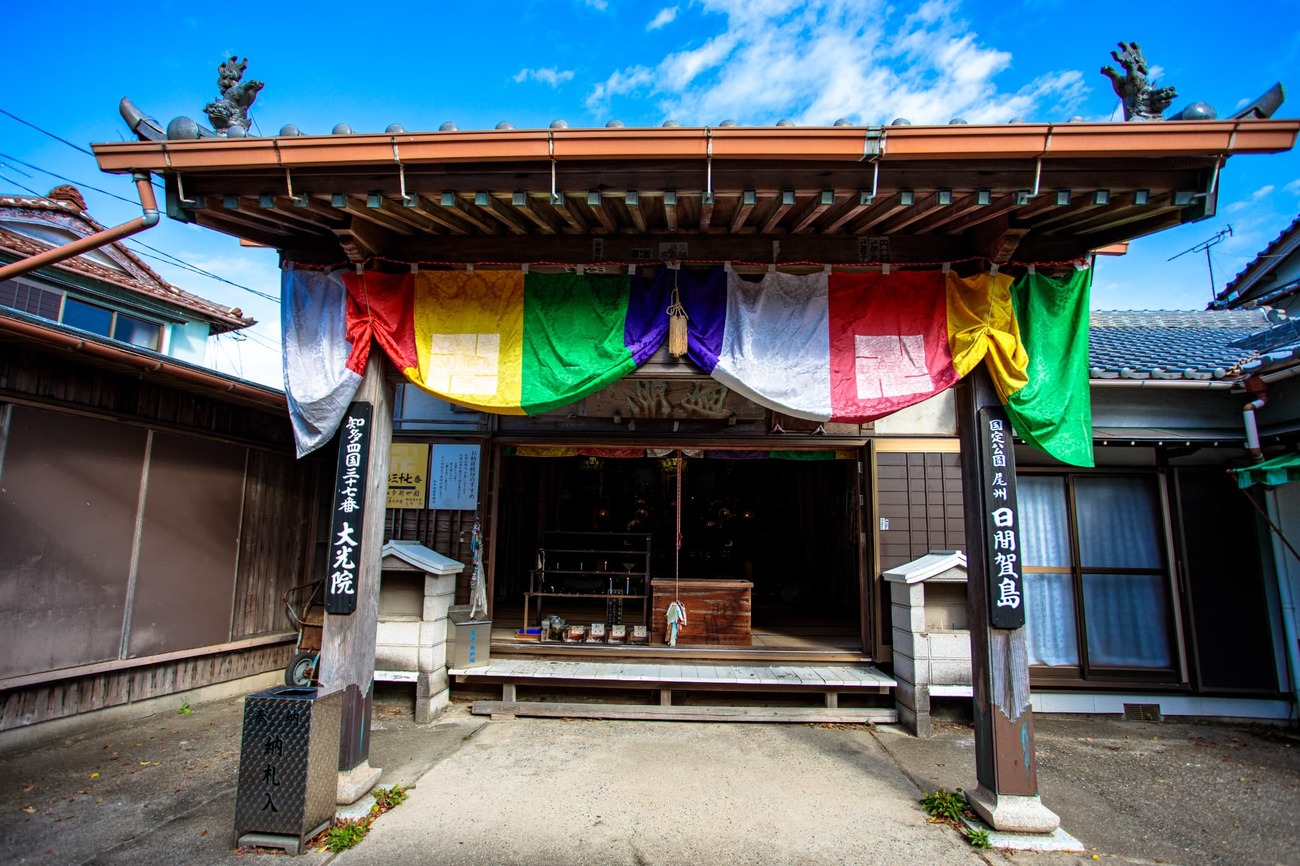 集落にはお寺が多く点在しています。「安楽寺」には、海から引き上げられた時に大ダコが守るように抱きついていた阿弥陀如来が、「たこ阿弥陀」として祀られています。タコの吸盤にあやかり「良縁を吸い寄せる」ご利益があるとか。絵馬掛けにはお笑い芸人の濱口優さんの願い事と、その後の「かないました!」というお礼参りのサインがあり、その霊験あらたかさに思わず笑みがこぼれました。また、海沿いの「大光院」は知多四国八十八ヶ所の第37番札所で、右手に鯖を持ったユニークな「鯖大師」像もありました。観光客で賑わう表通りとは違い、静かな信仰の空気が流れています。