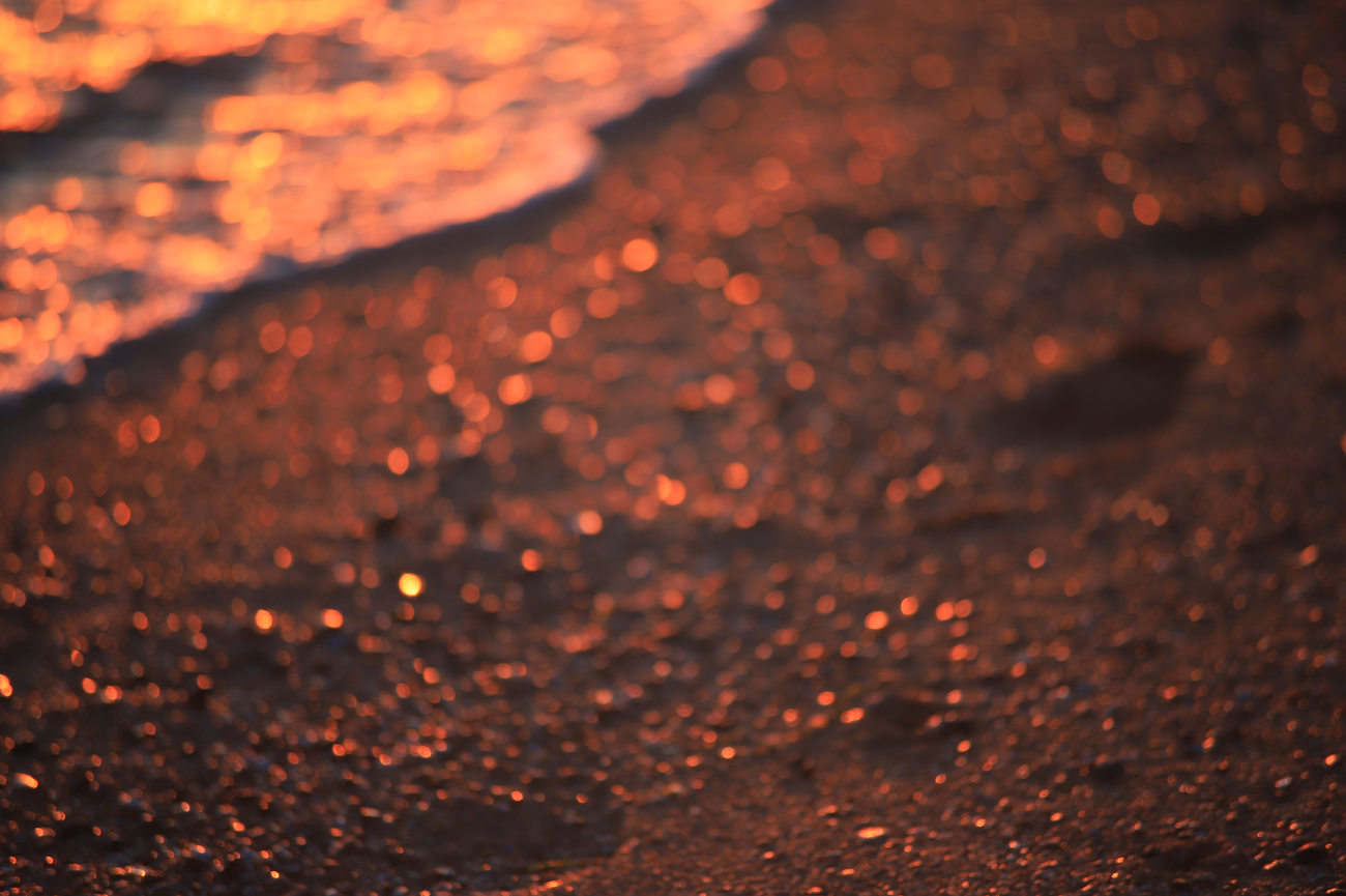浜辺で夕日を眺めるなら、なるべく低いポジションから撮影するのがオススメ。波打ち際を前ボケにし、いっそう夕日を感動的に撮影することができます。また光が当たっている波打ち際を望遠で切り撮るのも味がありますよ。あえてピントを少しずらして、玉ボケを作ってみるのも面白いです。