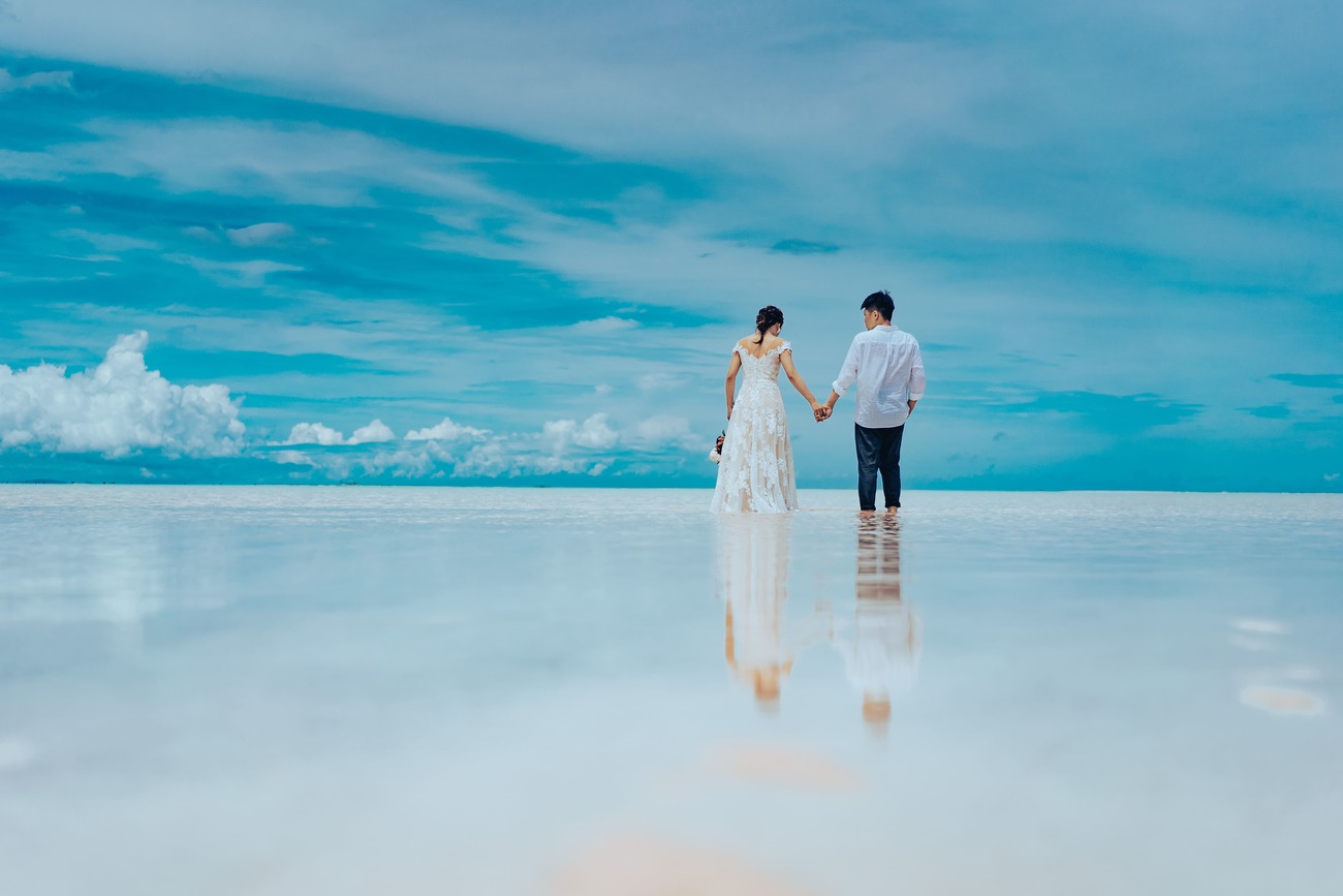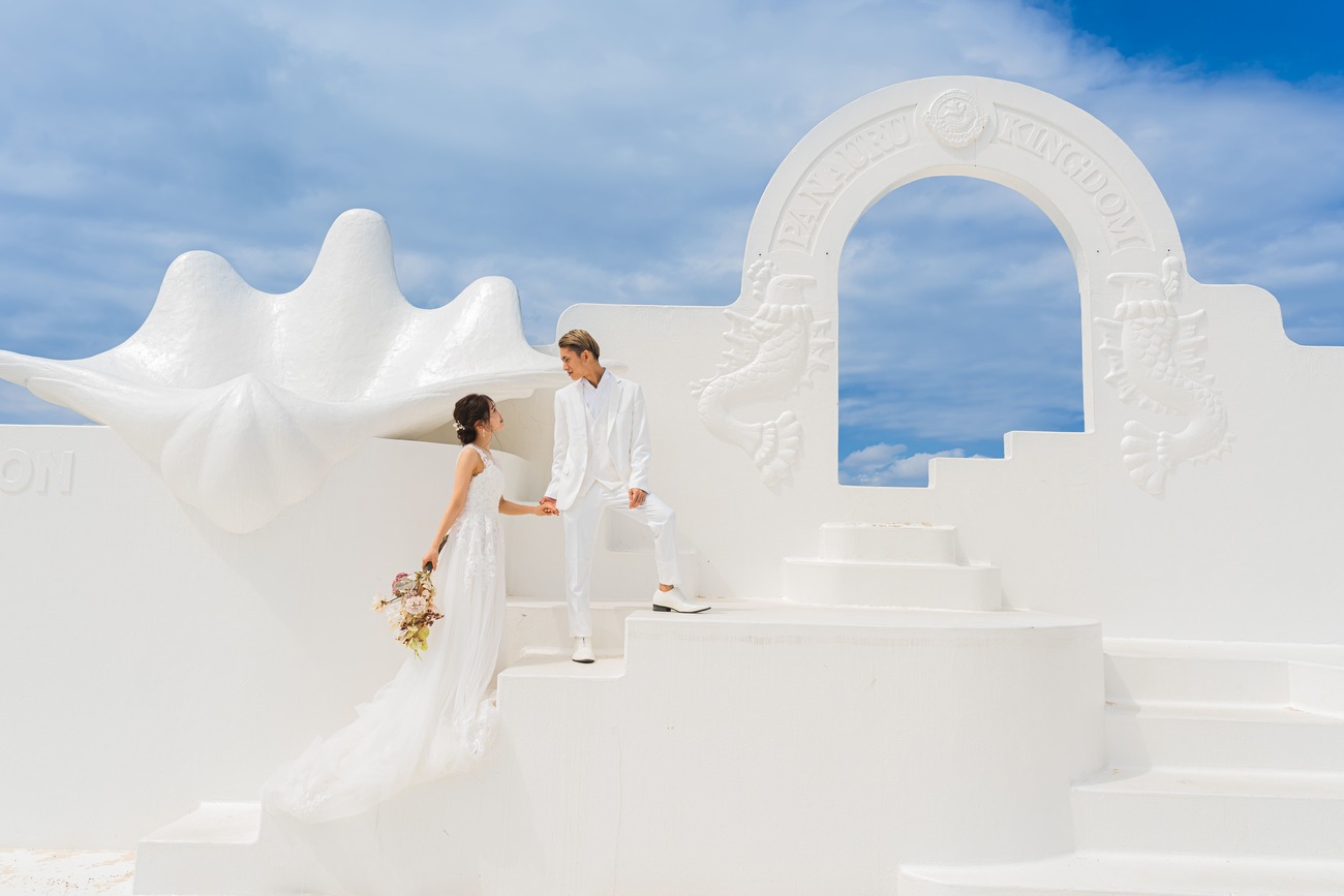 鹿児島県の最南端にある「与論島」。「東洋の真珠」と称される白い砂浜と透明度の高いエメラルドグリーンの海が広がり、まるで海外に来ているかのようなドラマティックな撮影が叶います。なかでも特に人気なのが、3〜10月の干潮時にしか現れない「百合ヶ浜」。海の中に砂浜が浮かび上がってできる幻の砂浜で、2人が海面に浮かんでいるような幻想的な仕上がりに。ギリシャ彫刻のようなモニュメントがある「茶花海岸ステージ」は、フォトジェニックな撮影にぴったり。真っ青な空と合わさり、エーゲ海にいるような気分を味わえます。ほかにも、パラダイスビーチの夕焼け時を狙えば、太陽が海に沈む神々しい瞬間を収めることができますよ。