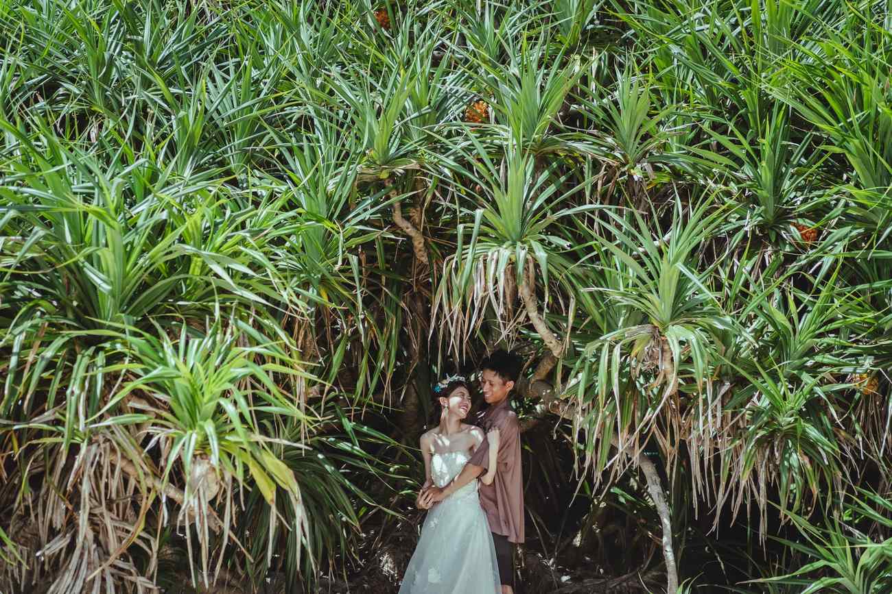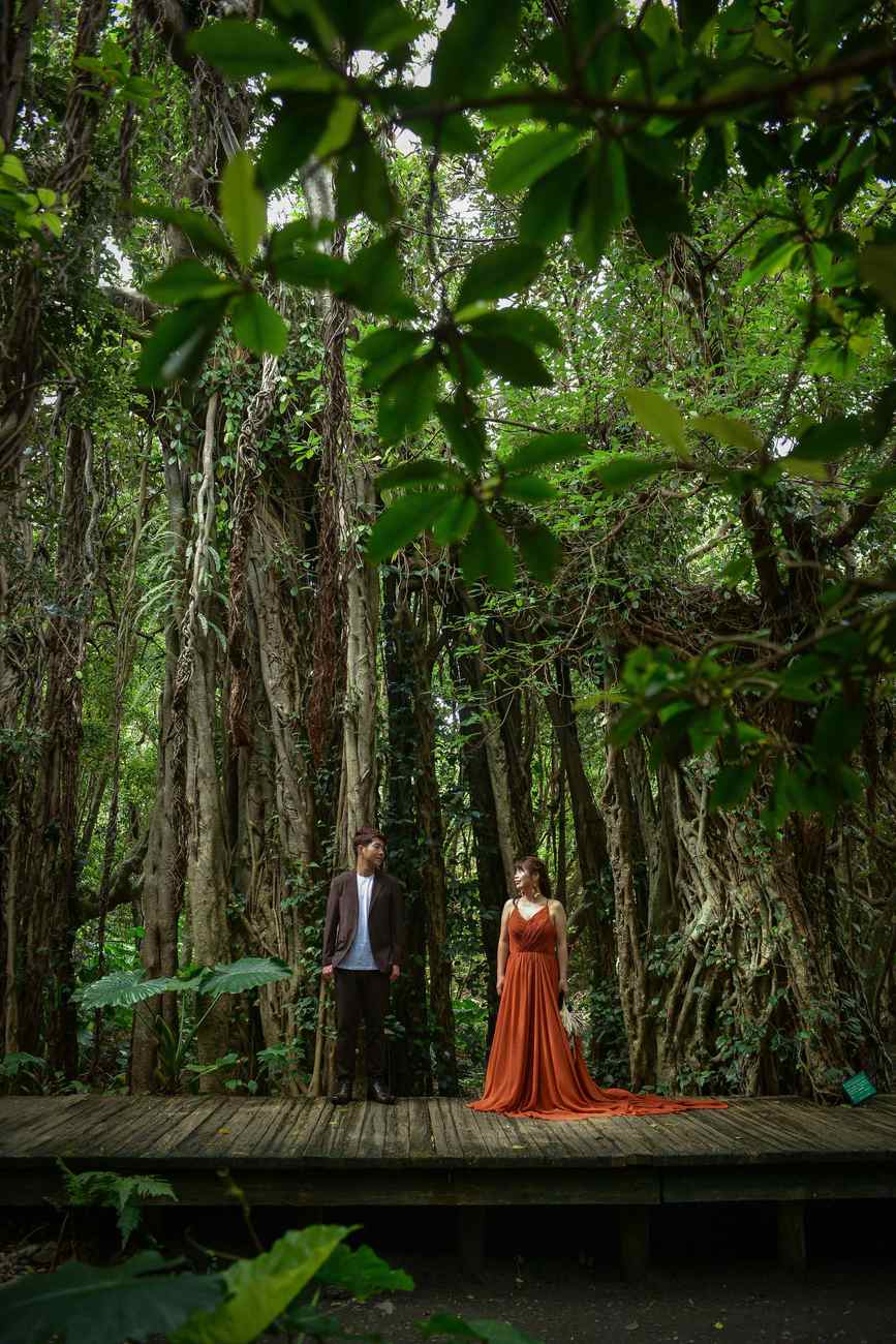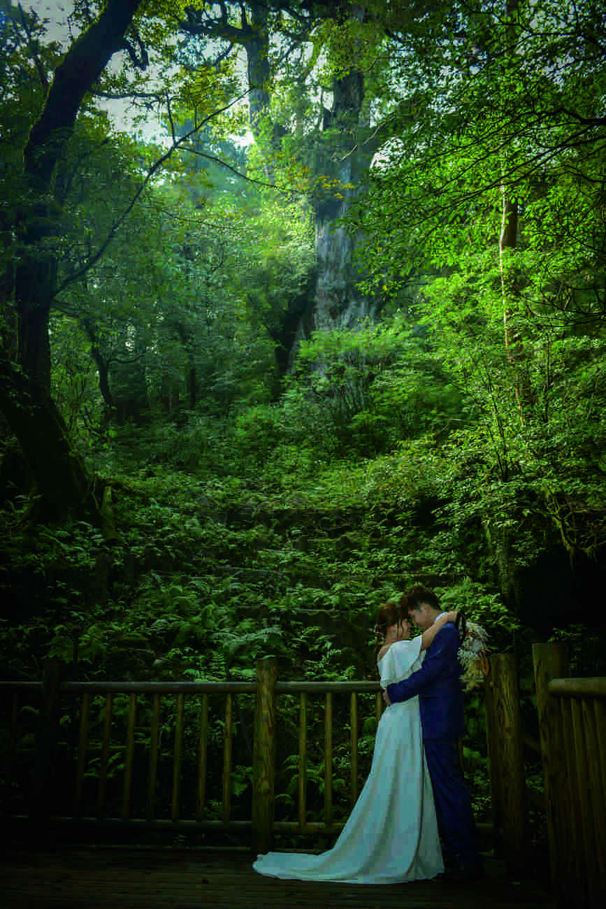樹齢1,000年超えの屋久杉が生える原始の森があり、世界自然遺産にも登録されている「屋久島」。島のほとんどが山や森に覆われ、マイナスイオンをたっぷり浴びてリラックスしながら撮影することができます。屋久島のシンボル的存在になっている「縄文杉」で撮影すれば、太古の昔から姿を変えずに存在する美しい自然を背景としたダイナミックな写真に。「縄文杉」に至るまでのトレッキング体験も含めて、他にはないフォトウエディングの思い出となることでしょう。島内一のガジュマルが見られる「志戸子ガジュマル公園」も人気のロケーションのひとつ。ジャングルの中に2人だけが存在しているような神秘的な雰囲気が広がります。