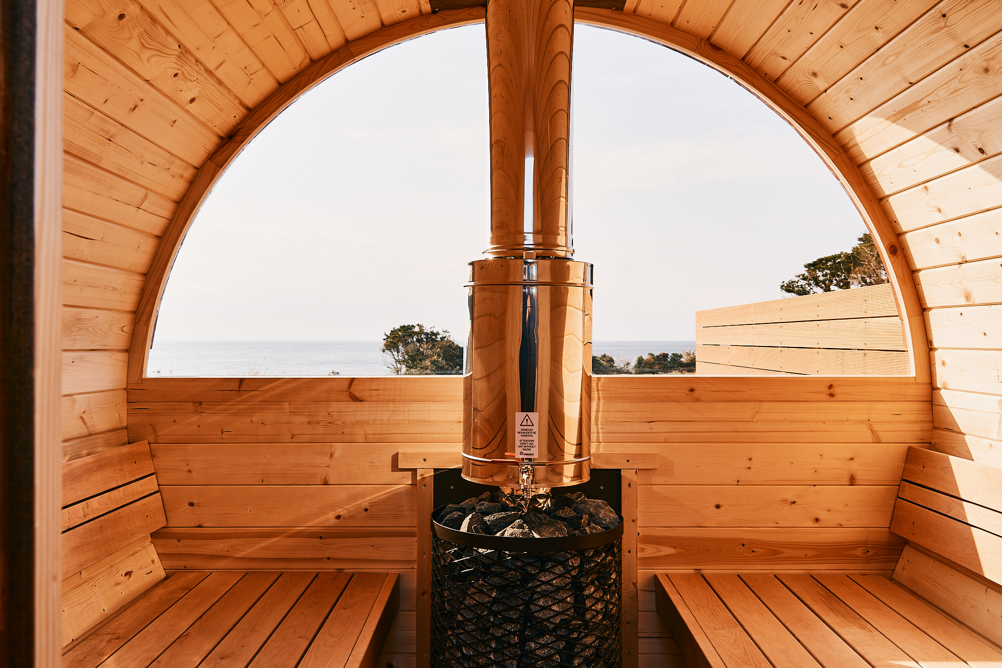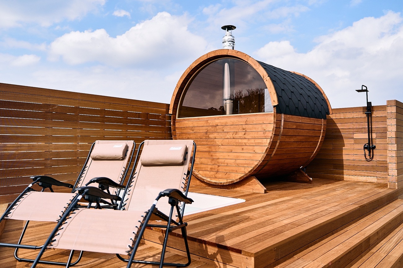 そんなリゾートヴィラにはサウナ大国の北欧エストニア産の木材を使った本格バレルサウナが設置されています。バレルサウナとは、木製の樽にストーブを設置したサウナのこと。上部が円形になっているのでロウリュの熱が効率的に循環します。壱岐島の海を一望できる絶景バレルサウナで、薪ストーブの音と木の香りを感じながら体の芯まで温まる幸せ。水を張った露天風呂に浸かった後は、インフィニティチェアで外気浴。壱岐島の大自然のなかで極上のととのいを体感できます。自分で薪を焚べるところから体験できるのでサウナの充実感もひとしお。また、一棟貸しのため、好きな音楽をスピーカーで流しながらととのうなど、開放的でありながらプライベート感が抜群なところも魅力です。