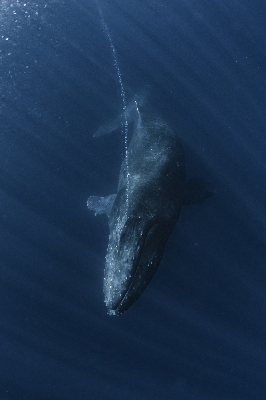 日本国内でホエールスイムの対象となっているのは「ザトウクジラ」です。体長は約13~16m、体重は30tほどの大きさになると言われており、ヒゲクジラという歯のないクジラに分類されます。体は大きいですが、主食はオキアミなどの小さな生き物なので、人間が捕食対象になることはありません。ザトウクジラの特徴は長い胸ビレで、水中を優雅に泳ぐ姿が私たちを魅了します。またクジラの中でもアクティブなので、胸ビレで水面を叩く動作や水面から体がすべて出るほど迫力のあるジャンプを見せてくれることもあります。