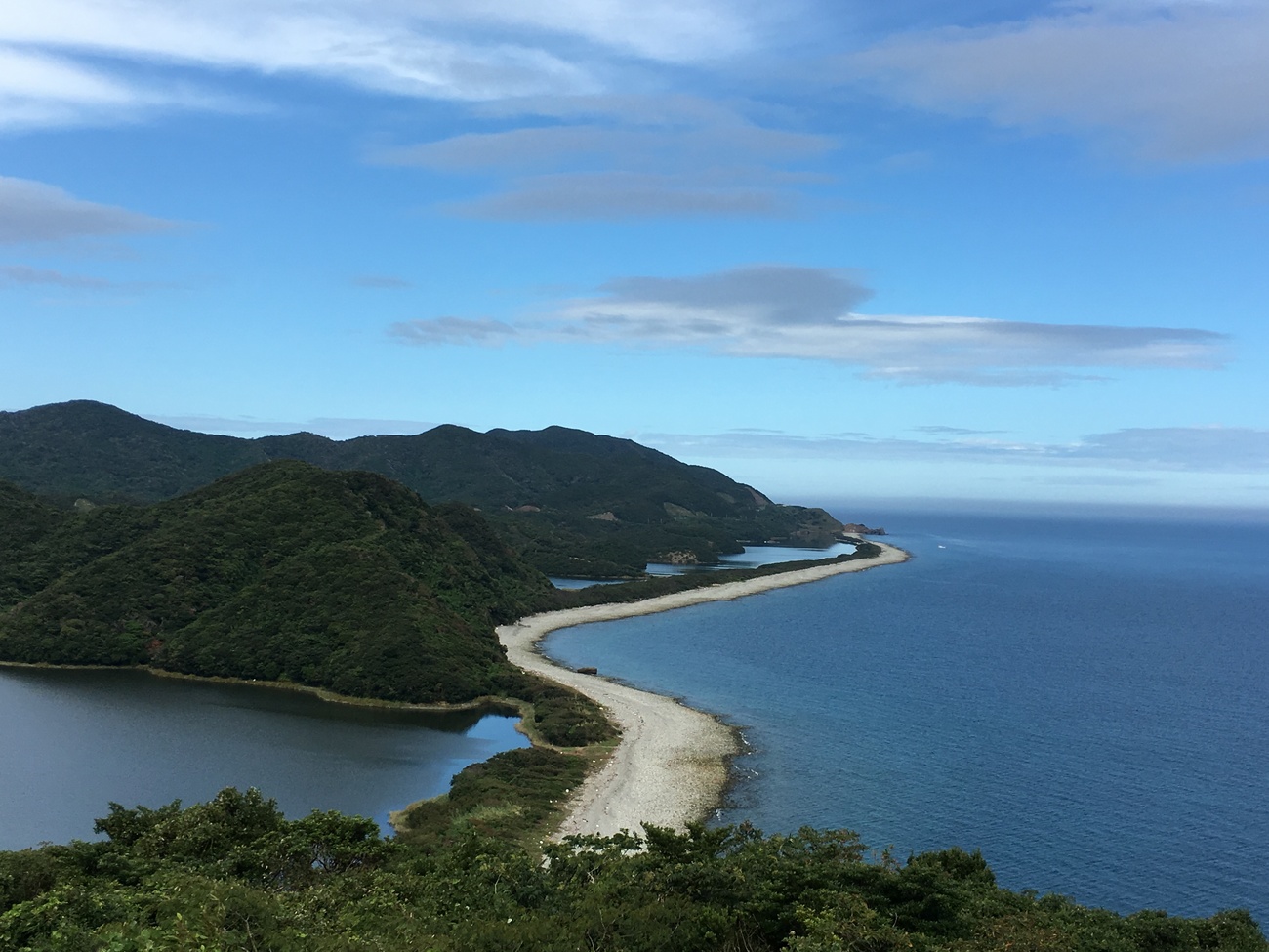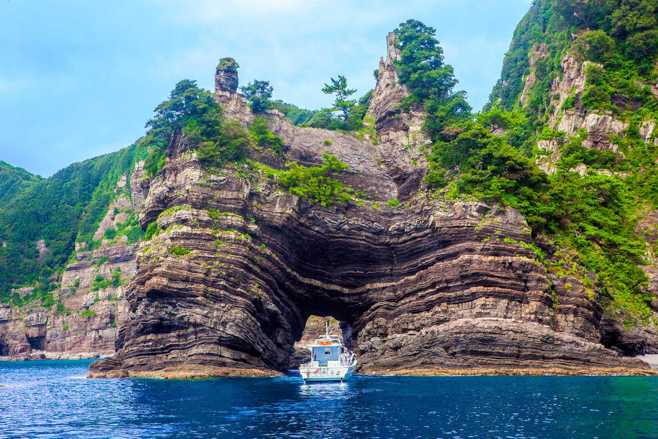 鹿児島県薩摩川内市に属し、本土から西方約26㎞の東シナ海上に位置する甑島。フェリーで約75分の距離にあり、上甑島・中甑島・下甑島の3島から形成されています。その魅力は何といっても雄大な自然。約8000万年前(白亜紀)から何層にも重なる地層の断崖、独特な巨岩は圧巻で、恐竜のいた時代にタイムスリップしたような気持ちになります。なんとこの断崖や巨岩が多い下甑島の瀬々野浦集落は「Drコトー診療所」のモデルとなった地域でもあります。上甑島には長目の浜という礫が堆積してできた幅50ⅿ、長さ4㎞ の砂州があり、自然が生んだ貴重な絶景を眺めることができます。