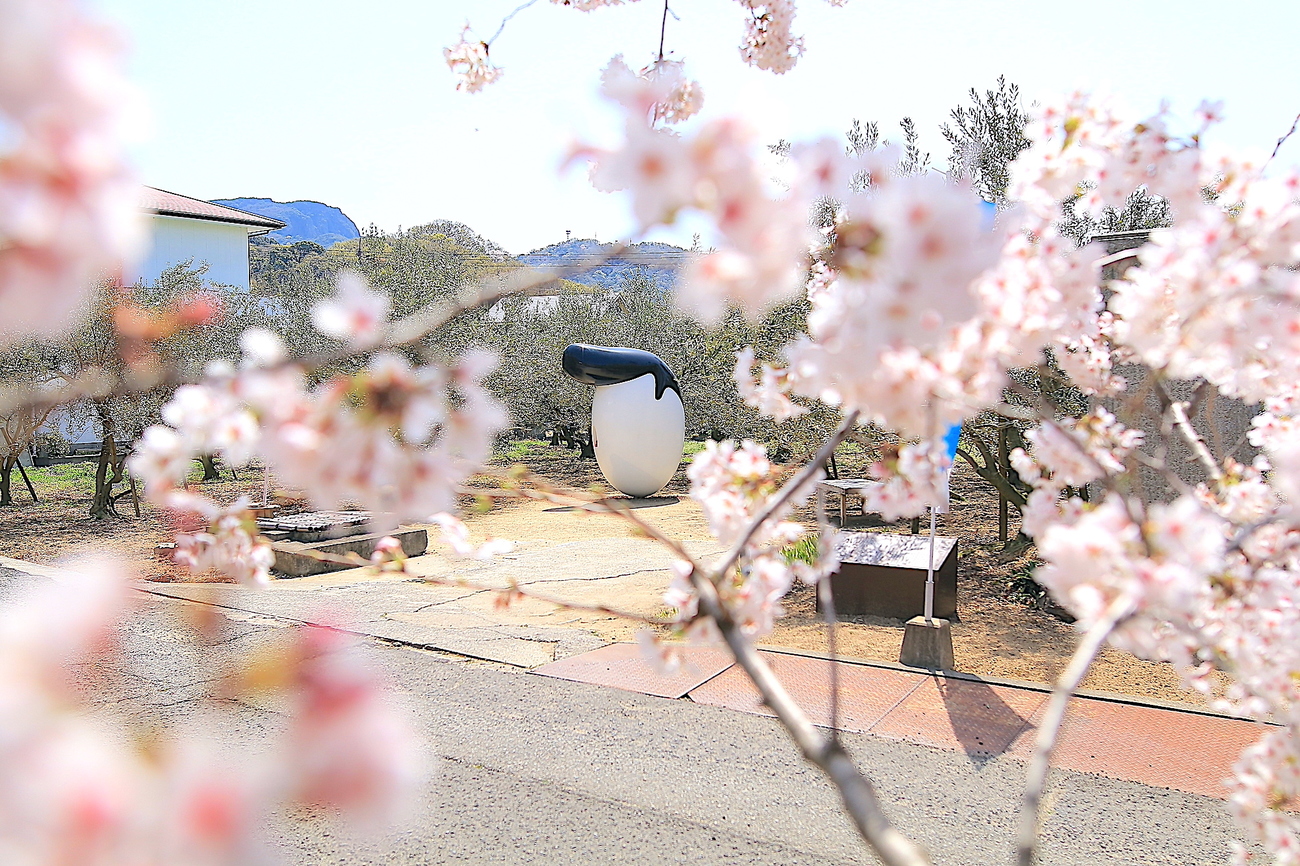 2022年には5回目の会期を迎えた「瀬戸内国際芸術祭」。新しい会期を迎えるたび、新しいアート作品の顔ぶれが増えていきますが、中には会期後も常設され、島の日常風景に溶け込むモニュメントになっている作品もあります。その代表例の一つが、清水久和氏の作品「オリーブのリーゼント」でしょう。もろみの香り豊かな醤油蔵ストリートを抜けると、オリーブに囲まれた広場にリーゼントのモニュメントが現れ、非日常の空間が演出されています。そんな小豆島を代表する癒しの広場に加わるのは春の花々。オリーブに寄り添うように満開の桜が咲き、隣接する花壇は水仙で彩られます。暖かい季節の訪れを感じつつ、その気持ちよさに思わずベンチでうたた寝をしてしまうかもしれません。