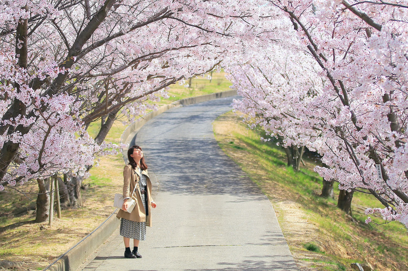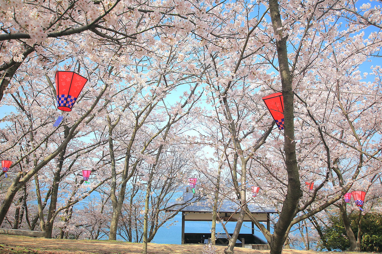 瀬戸内海を一望する高台に位置する「城山公園」。かつて南北朝時代、標高110メートルの山頂に居城を築かれたことから「城山」と呼ばれるようになったと言われるこの公園内には、桜が100本前後植えられており、春になれば小豆島を代表する桜名所に変わります。小豆島を舞台に描かれた名作『二十四の瞳』中で描かれる、桜の木の下で電車ごっこをして遊ぶシーンもこの公園で撮影されました。ずっと続いていく桜並木のトンネル、その間から飛び込んでくる瀬戸内海の多島美や、フェリーが行き交う情景。ハイライトとなる展望台「桜花亭」には、ピンクの空間に顔を覗かせる真っ青な海。ひたすらに春らしい穏やかさと心躍る瀬戸内海のワンシーンが、そこには待っています。