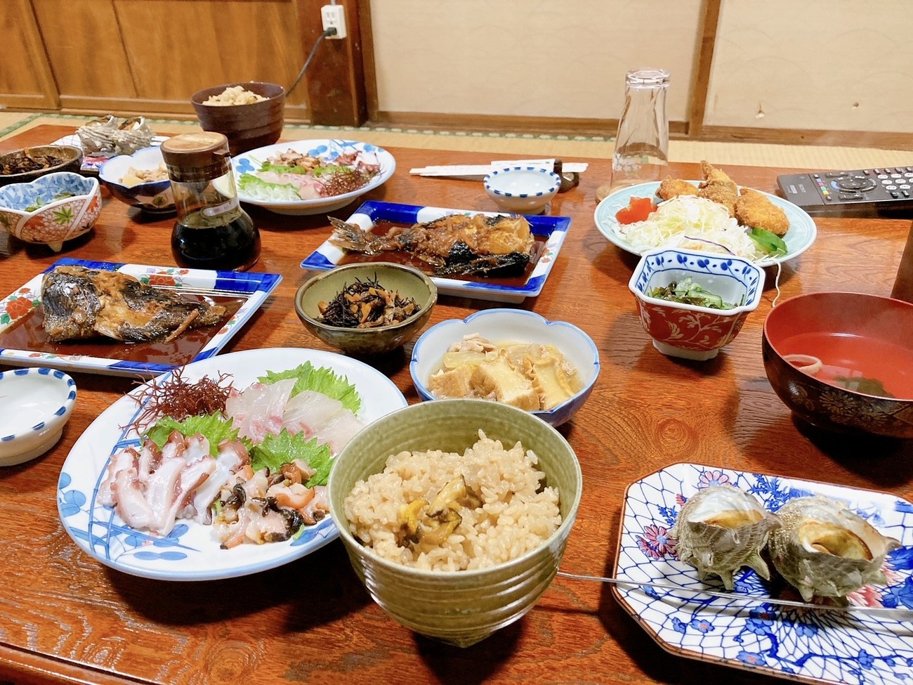 島で獲れた新鮮な海の幸。島には飲食店がありませんが、島内にある民宿にて食べることができます(要予約)。魚の刺身や煮付けはもちろん、特産品でもある島のサザエは、刺身やつぼ焼も絶品ですが、新鮮なサザエと島のしょうゆで作った「サザエご飯」は大人気。何杯でもいけてしまいます。