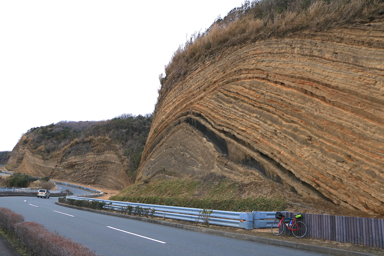 首都圏からもアクセスしやすい「伊豆大島」。東京品川の竹芝港から東海汽船のフェリーでアクセスでき、深夜便も運行しているため、土日休みなどでも手軽に自転車一周に挑戦することが可能です。一周約50kmという手頃な距離であり、海岸線には火山島らしい情緒を見せる景色の連続です。火山噴出物から身を守る避難シェルター、マグマが噴出して形成されたと言われる筆島、火口湖を切り開いた波浮港見晴台など、どこかRPGの中に迷い込んだような世界観を見せてくれます。中でも驚いたのは、島の西部にある地層切断面です。通称“大島のバームクーヘン”と呼ばれる地層面は、さながら台地に刻まれた年輪のよう。大島の活発な火山活動を物語っています。一周50kmほどと手軽なため、余裕があれば三原山ヒルクライムに挑戦してみるのもオススメ。「島の上に、こんな広い空間があったなんて...!!」と、思わず息を呑むダイナミックな風景が広がります。