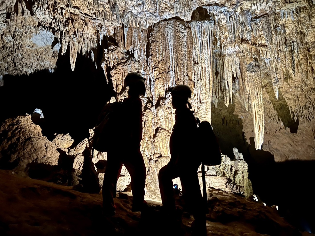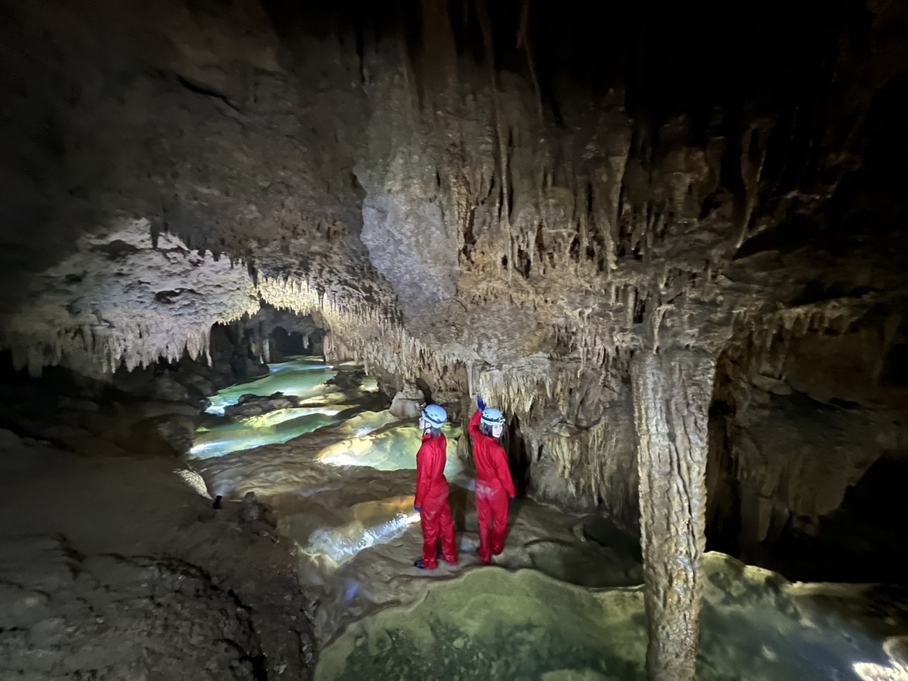 真っ暗な洞窟の中をプロのガイドさんとヘッドライトの明かりを頼りに探検する。