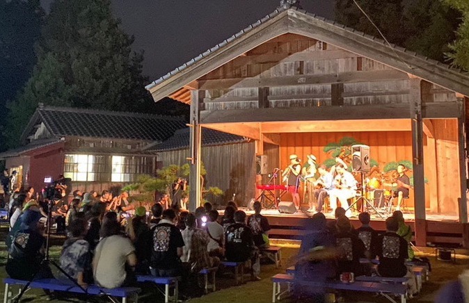 2日目終了後に、イベントのスペシャルTシャツを購入した方のみが招待されるシークレットライブ。出演アーティストたちのコラボによるスペシャルセッションが、神社の境内にある能舞台で行われました。荘厳で幻想的な雰囲気の能舞台と、迫力満点の生演奏が融合する唯一無二の空間。夏の記憶を彩る特別な時間を過ごすことができました。