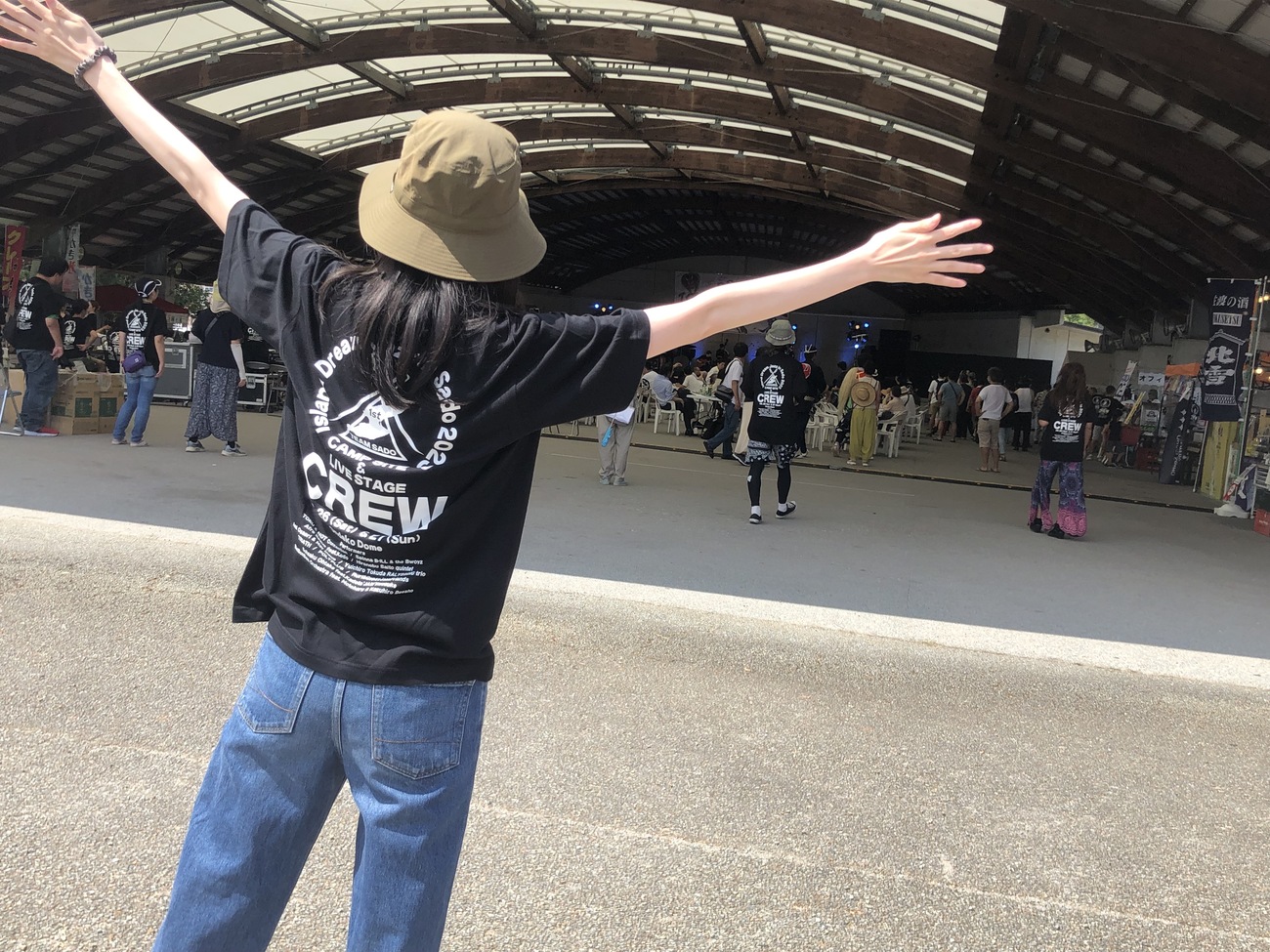イベントの中で私たちボランティアスタッフは、受付やグッズ販売、ステージの設営、撮影班、まかない班などそれぞれの持ち場に分かれて運営を行いました。私は2日間、お客さん案内や問い合わせ対応を行う受付係を担当しましたが、一緒に動くスタッフは年齢や出身、普段の仕事もさまざまです。小笠原諸島で船員として働く人や、ジャズが大好きで仕事の合間をぬって福岡から駆けつけた人、大学のゼミ実習として参加した大学生たち。「ジャズの力で佐渡島を盛り上げたい」という気持ち1つで団結し、イベントの運営を行いました。初めてお会いする方ばかりでしたが、イベントを楽しみながら一緒に動いているうちにどんどん打ち解け、イベントが終わるころには「私が住んでる〇〇島にも遊びに来てくださいね!」「次はもう一度、このしま夢ジャズでまた会いましょう!」と話すように。今回のイベントは、アーティストやお客さんをはじめ、実行委員会、協力企業、島内外から駆けつけたボランティアスタッフの全員で作り上げたものなんだと実感しました。