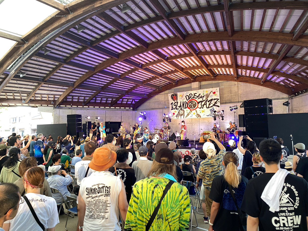 まだ暑さが残る8月最後の週末。両津港からすぐの場所にあるおんでこドームにて、夏を締めくくる島イベント『しま夢ジャズ•イン•佐渡』が開催されました。このイベントを主催するのは、2016年に東京•小笠原諸島でジャズフェスティバルを成功させたメンバーを中心に結成されたしま夢ジャズ実行委員会です。2023年度の開催場所は、佐渡金銀山の世界遺産登録に向けて歩む佐渡島。実行委員会は佐渡島での開催が決まってから、たびたび島を訪れ、会場の下見や島内で協力者を募るなど地道な活用を続けてきました。SHIMA-Omoi編集部は、実行委員会が掲げる「しまの持続可能で豊かな成長を通して、島国ニッポンを元気に!」というテーマに賛同し、日本の有人離島を紹介するWEBメディアとして「島のために活動する人々や観客のみなさんと一緒になって、島を盛り上げたい」という想いで、ボランティアスタッフとしての参加を決意。イベントの2日間、片付けの期間を入れて計3日間、実行委員会やボランティアスタッフの方々と、協力しながらイベントを作り上げていきました。