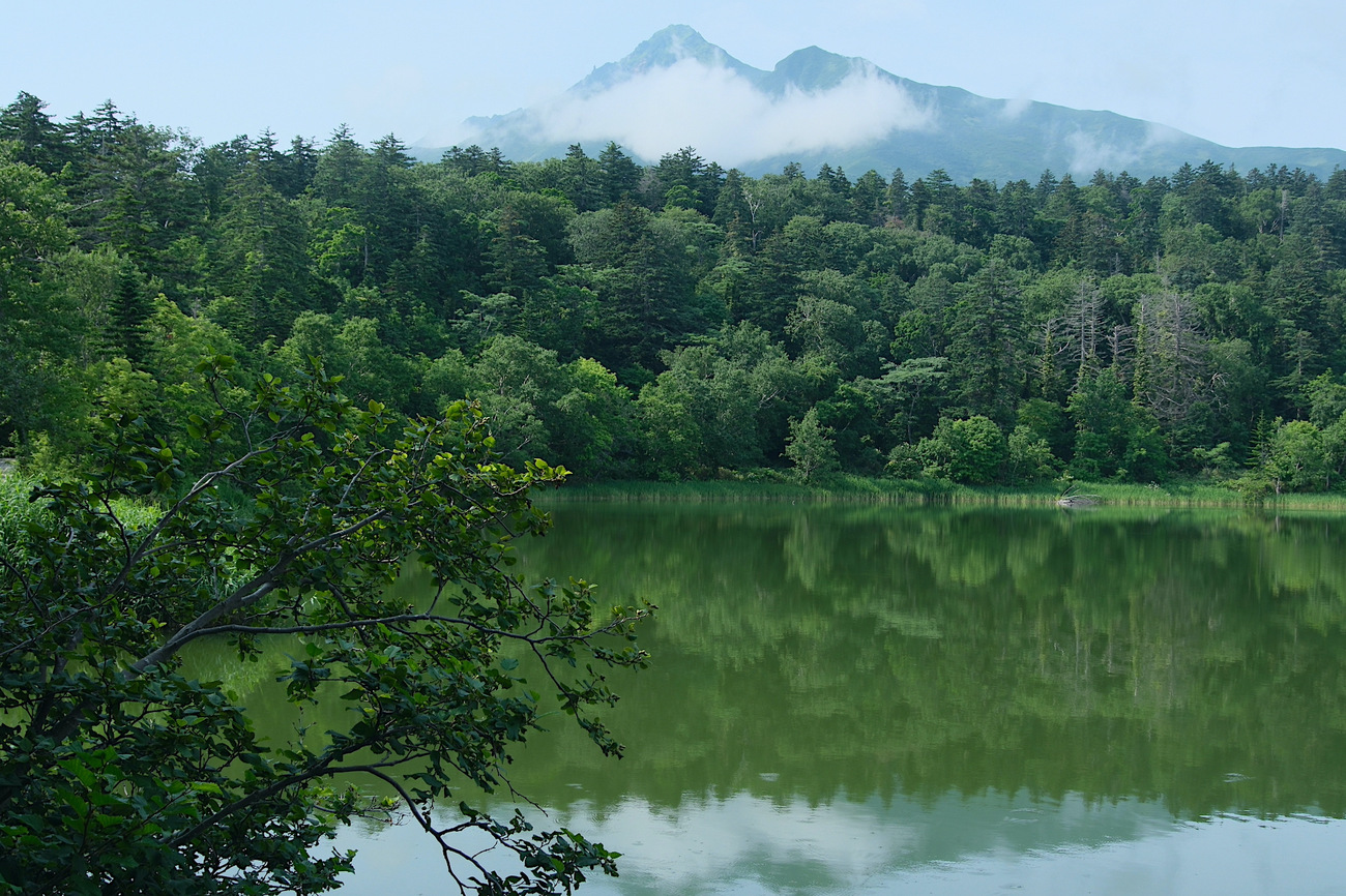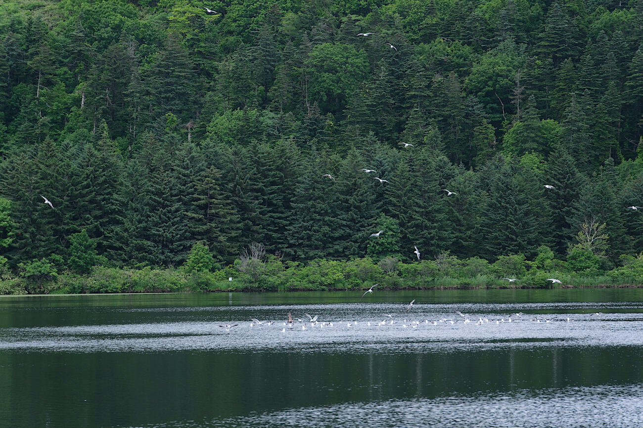 鬼脇で資料館の見学とスイーツを楽しんでいたら、何だか雲行きが怪しくなってきたため先を急ぐことに。北海道銘菓・白い恋人のパッケージにも使用された、利尻山の風景がみられる「沼浦展望台(白い恋人の丘展望台)」へと向かいましたが、利尻山はあいにくの雲の中でした。利尻島といえば、真っ青な空の下でそびえる利尻富士(利尻山)がトレードマークですが、地元民の方によると、実は快晴の日は滅多にないとのこと。晴れの天気でも、方角によって山は見えたり見えなかったりというのが、日常茶飯事なのだそうです。少し残念ではありましたが、これも洋上に高山がそびえ立つ、”利尻島ならではの情緒”ですね。展望台の下にある「オタトマリ沼」には、たくさんの海鳥が飛来し、一面の原生林が水面に映り込んでいました。まるでパソコンのデスクトップ壁紙のような美しい風景を眺めつつ、穏やかな静寂に浸りました。曇りでも周囲に目を凝らせば、利尻島らしい自然や生き物との出会いに満ちています。
