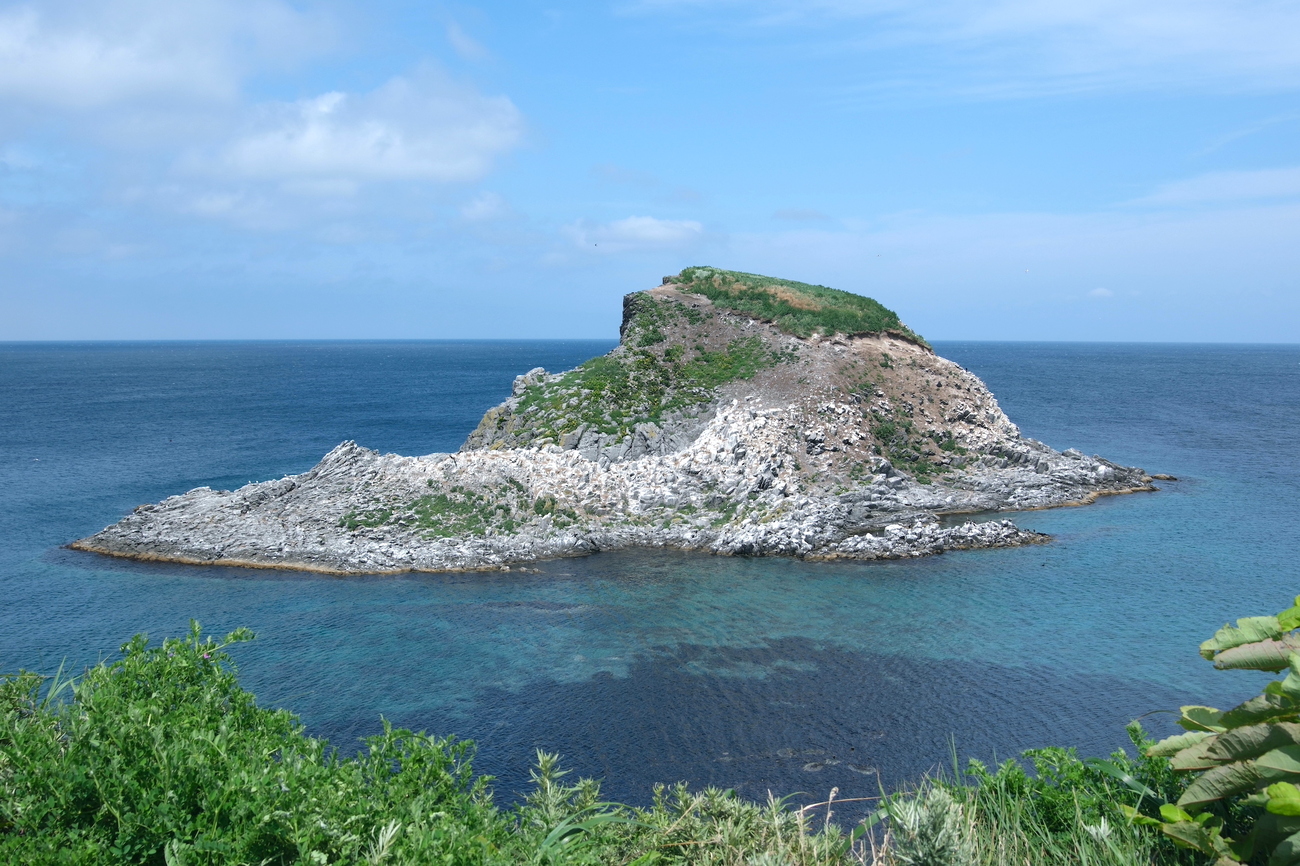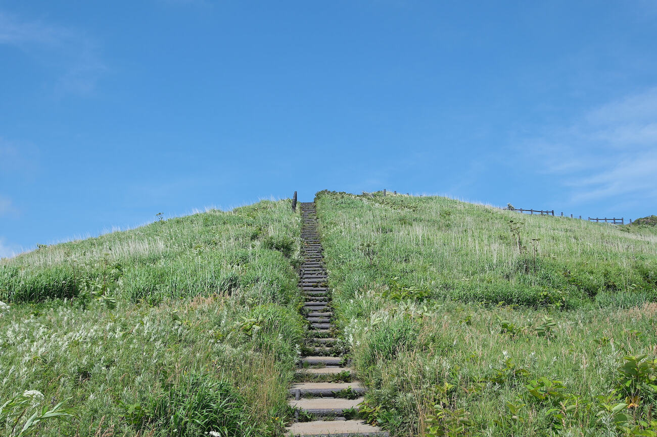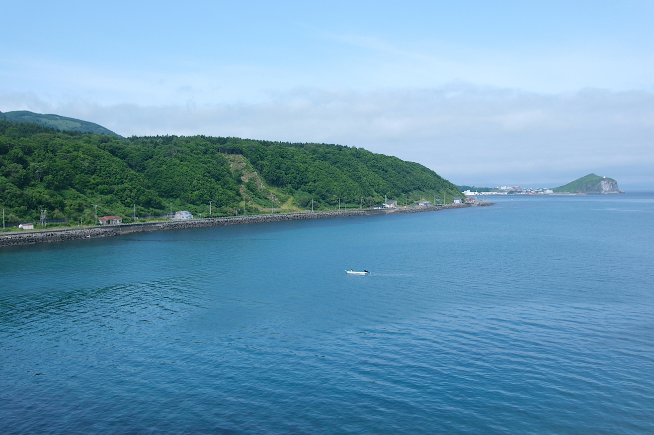 あとは利尻空港の横を通過して、スタート地点の鴛泊港フェリーターミナルを目指します。道中はずっと利尻山の方角が曇っていたのですが、北部に向かうにつれ山の姿が見えてきました。「島の北と南でこうも違うものなのか!?」と驚きましたが、北部に至ると、風になびく草原と利尻山が共演する富士野園地や、海底までくっきり海の色が透き通ったポンモシリ島、空と緑の対比が美しい夕日ヶ丘展望台など、思わず息を呑む素晴らしい風景が待っていました。母なる利尻山の噴火でできた溶岩台地が、一つの島を呈している「利尻島」。思わず手を広げて深呼吸をしながら、壮大な地形美をしっかりと目に焼き付けることができました。ラストは港まで爽快に走り抜け、約6時間にわたる原付一周旅の完了です。半日ほどですが、原付の機動力で利尻島の魅力を存分に満喫できた気がします。