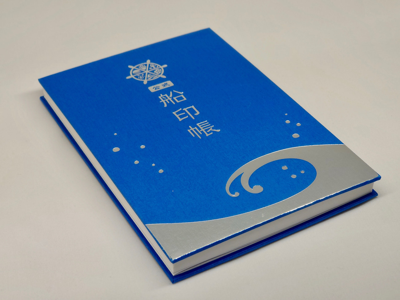 御船印めぐりプロジェクト事務局が制作した公式船印帳の「瑠璃の壱」。プロジェクトのテーマカラーである瑠璃色を使い、海のきらめきを表現する銀色の箔をあしらったデザインです。その昔、瑠璃色の原料となる石は、中央アジアでしか産出されず非常に貴重でした。別名をウルトラマリンと呼ばれ、多くの芸術家は「海を超えた色」として憧れていたのです。船に乗って旅する先に、多くの発見と感動がありますようにと、願いを込めてデザインしました。