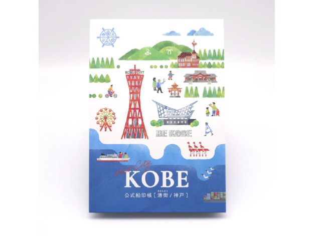 神戸市とのコラボ船印帳です。1868年の開港以来、多くの外国人が来訪・居住し、モダンな文化を育んできた街「神戸」。海側から見た神戸の街並みとともに、神戸に暮らす人、訪れる人たちが街を楽しげにめぐる様子が描かれています。裏面には、開港150周年を記念し、英国紋章局で制作された神戸港の紋章を配置。紋章には「北前船」や港の朝夕の賑わいを示す図案が描かれており、神戸港の歴史と繁栄が表現されています。