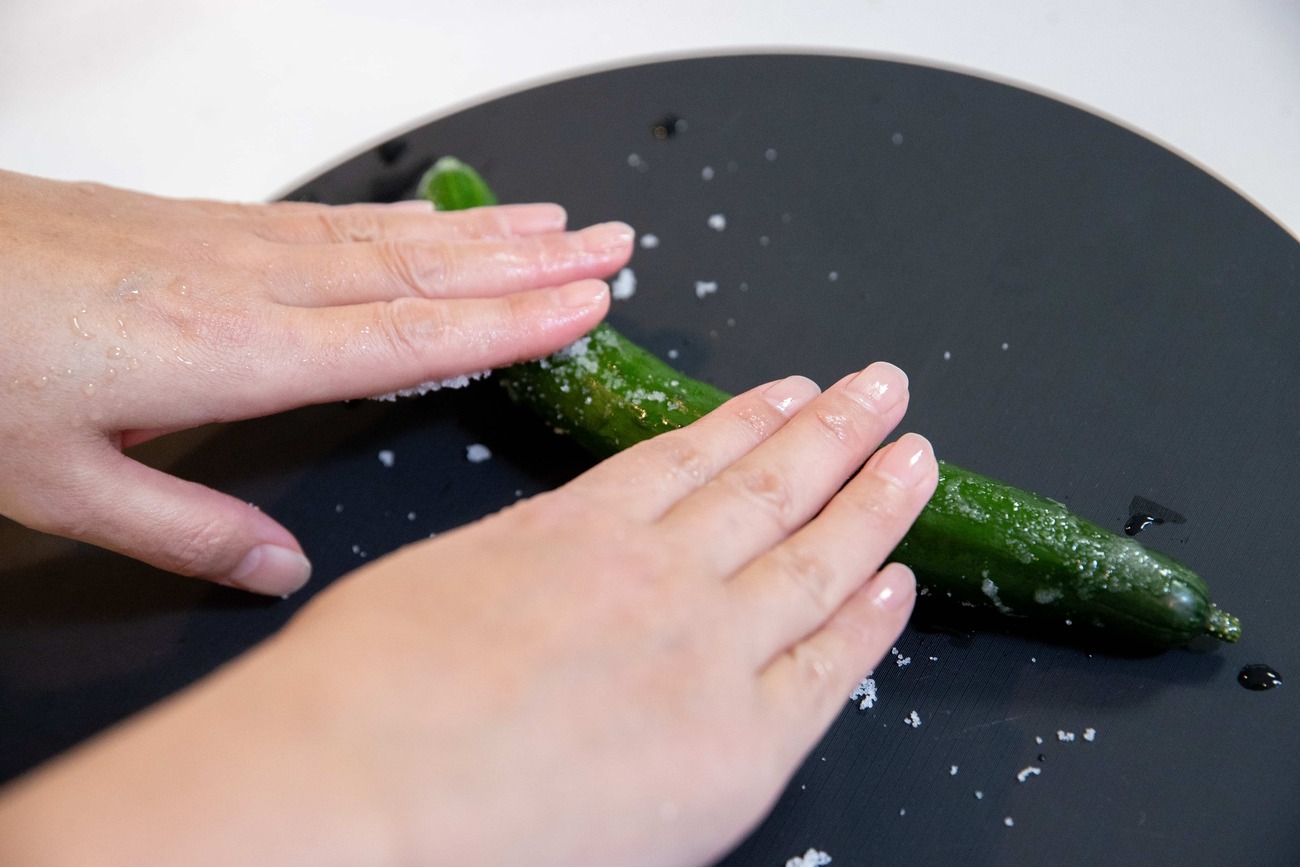 まずきゅうりを塩で板ずりし、ヘタを切り落とします。