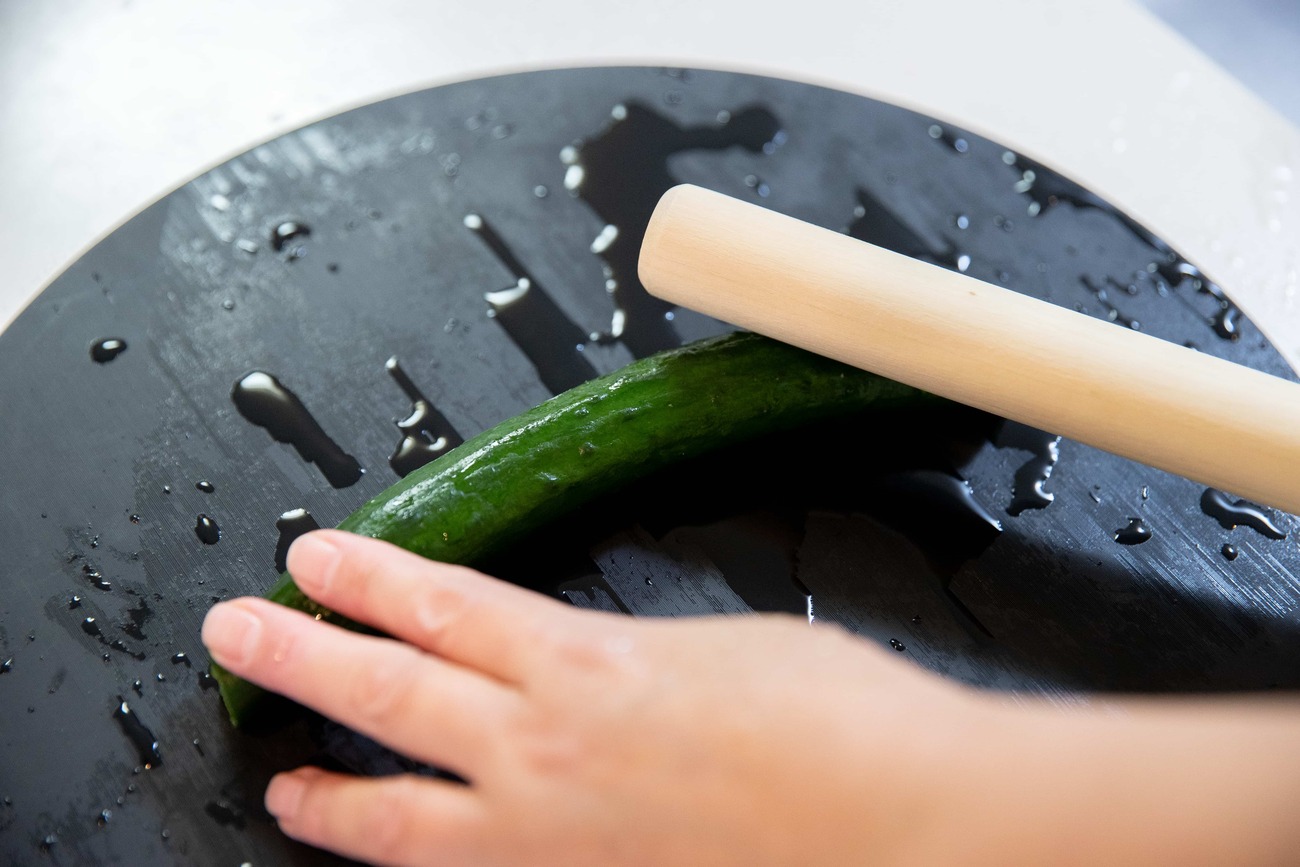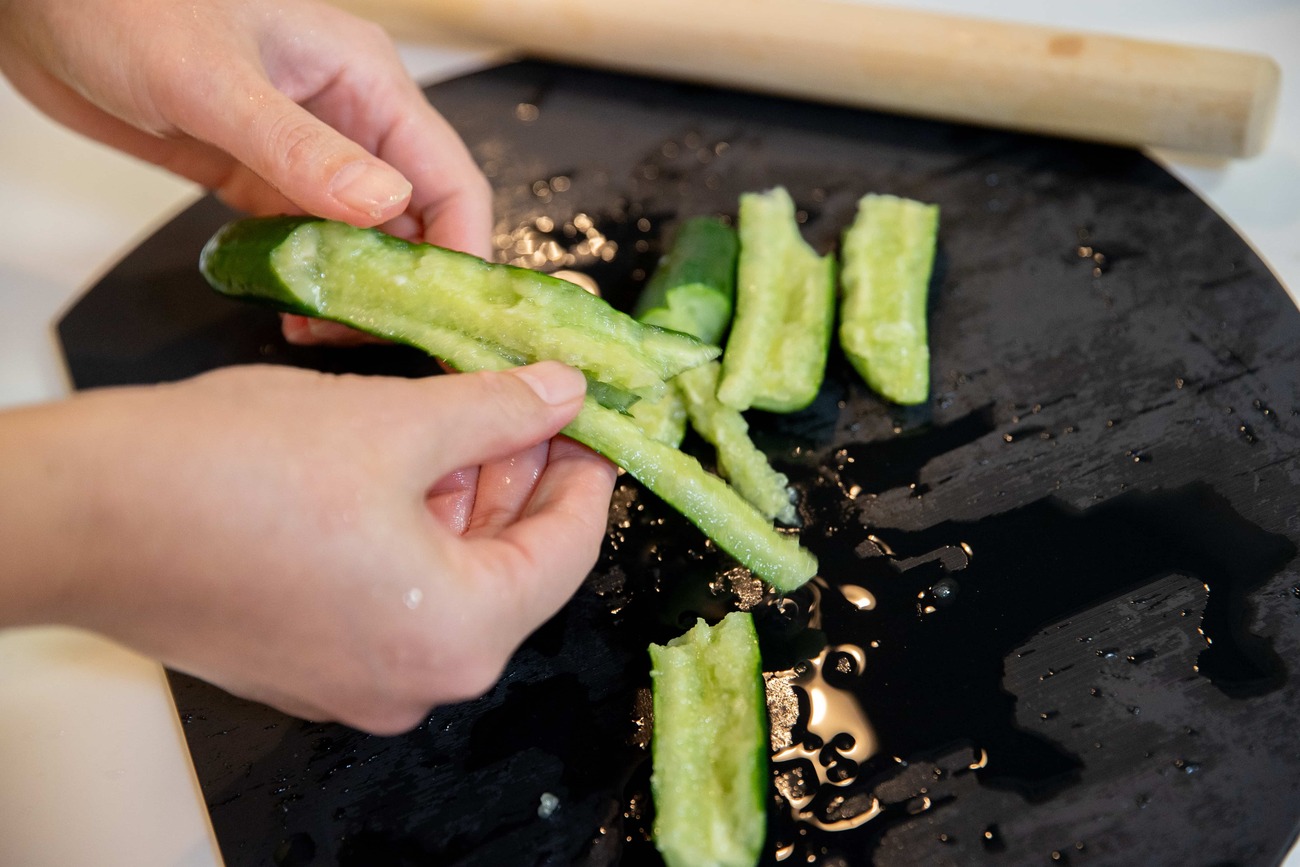 めん棒で軽く叩き、食べやすい大きさにカットしますが、包丁を使わず割れた部分を活かして割いていくと、味が染み込みやすくなります。