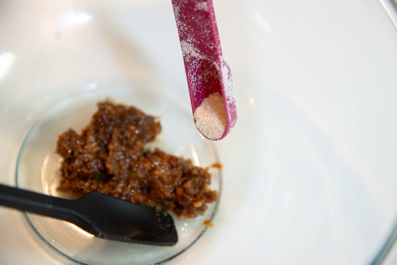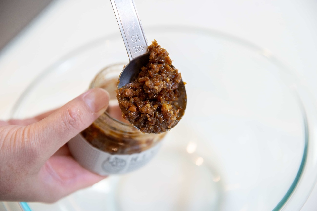ボウルに小醤油みそ、酢、ゴマ油、きび砂糖を入れ、よく混ぜ合わせます。