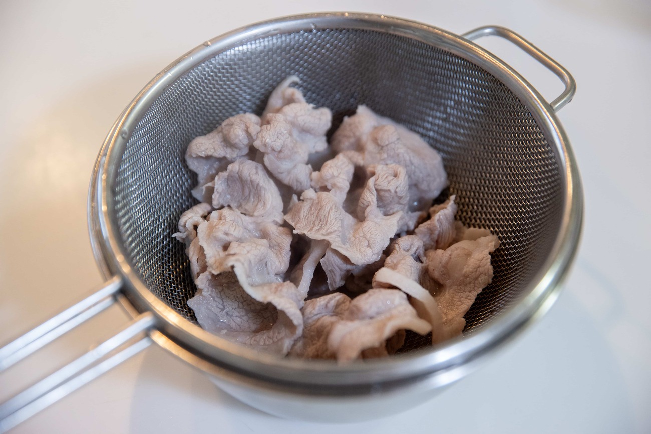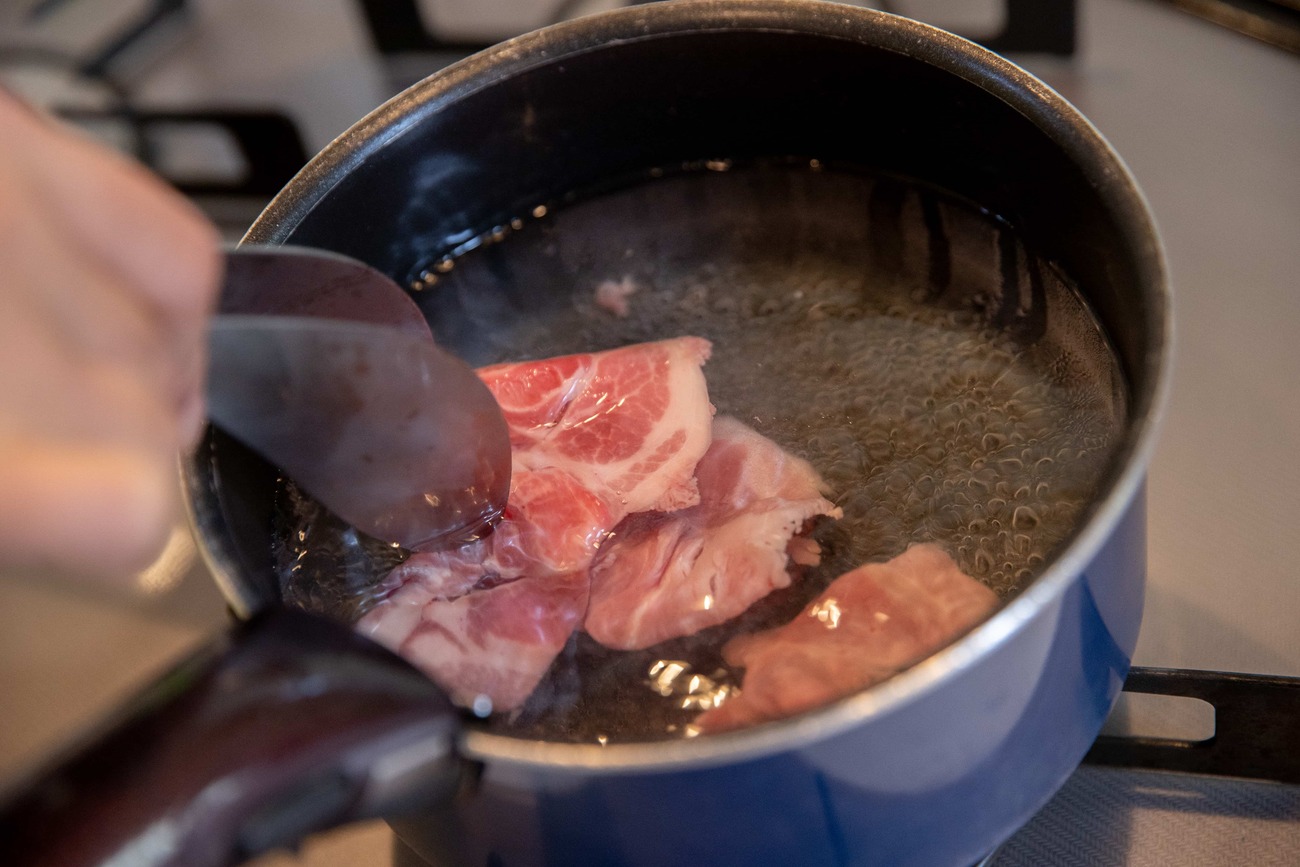 鍋でお湯を沸かし、沸騰したら豚肉をさっと茹でます。