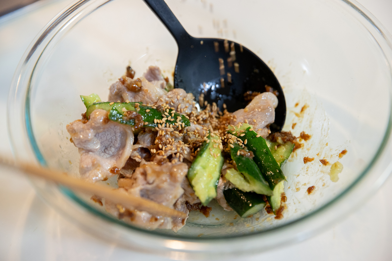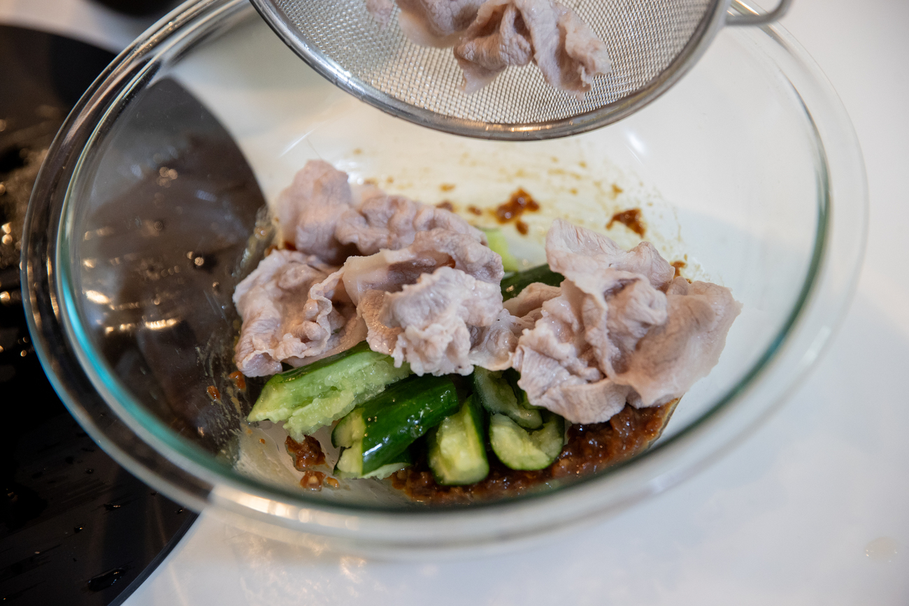 ②で混ぜ合わせた調味料と、きゅうり、豚肉、いりごまを軽く混ぜ合わせます。