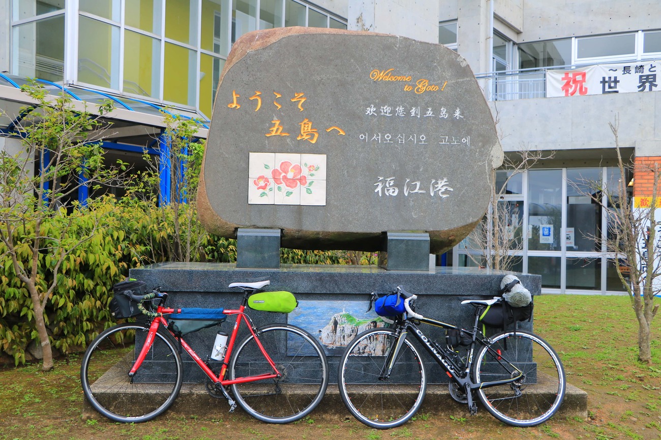 まず最初に訪れたのは、五島列島の南部にある「福江島」。長崎港〜福江港をむすぶフェリーに乗って、3時間半前後でアクセスすることができます。美しい海を期待していたのですが、あいにく天気が悪く、初日は観光をすることに。福江城址を歩いたり、五島牛の焼肉や五島うどんをいただきました。天気次第で楽しみ方を変えるのも、自転車旅ならではです。